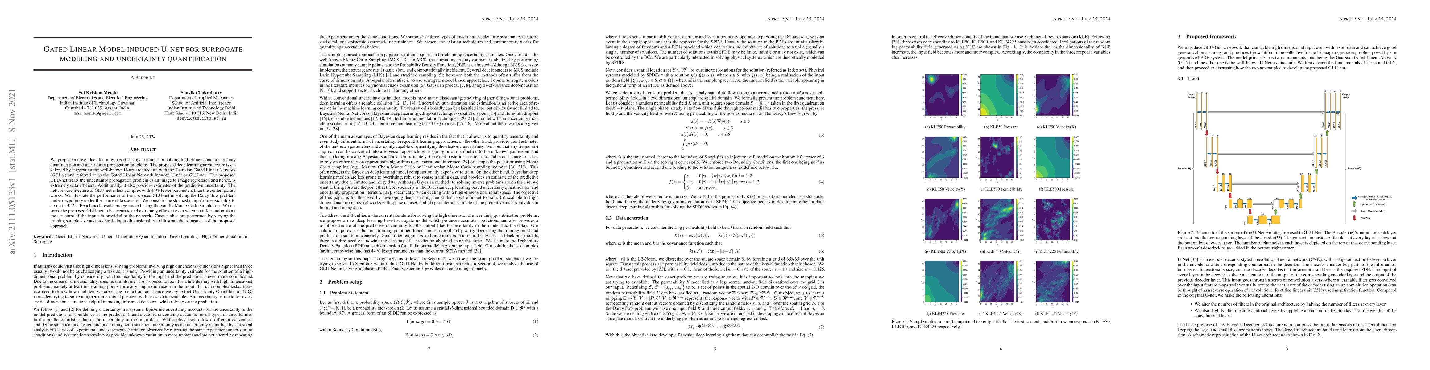 We propose a novel deep learning based surrogate model for solving high-dimensional uncertainty quantification and uncertainty propagation problems. The proposed deep learning architecture is developed by integrating the well-known U-net architecture with the Gaussian Gated Linear Network (GGLN) and referred to as the Gated Linear Network induced U-net or GLU-net. The proposed GLU-net treats the uncertainty propagation problem as an image to image regression and hence, is extremely data efficient. Additionally, it also provides estimates of the predictive uncertainty. The network architecture of GLU-net is less complex with 44\% fewer parameters than the contemporary works. We illustrate the performance of the proposed GLU-net in solving the Darcy flow problem under uncertainty under the sparse data scenario. We consider the stochastic input dimensionality to be up to 4225. Benchmark results are generated using the vanilla Monte Carlo simulation. We observe the proposed GLU-net to be accurate and extremely efficient even when no information about the structure of the inputs is provided to the network. Case studies are performed by varying the training sample size and stochastic input dimensionality to illustrate the robustness of the proposed approach.