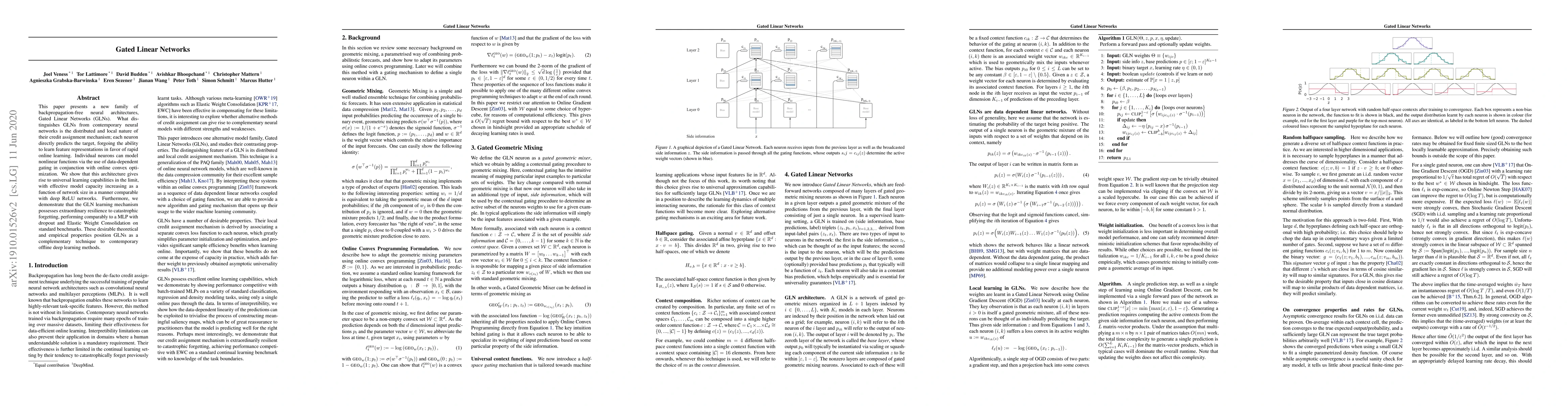 This paper introduces Gated Linear Networks (GLNs), a novel backpropagation-free neural architecture that enables rapid online learning through a distributed credit assignment mechanism. GLNs exhibit universal learning capabilities and exceptional resilience to catastrophic forgetting, positioning them as a viable alternative to traditional deep learning methods.
