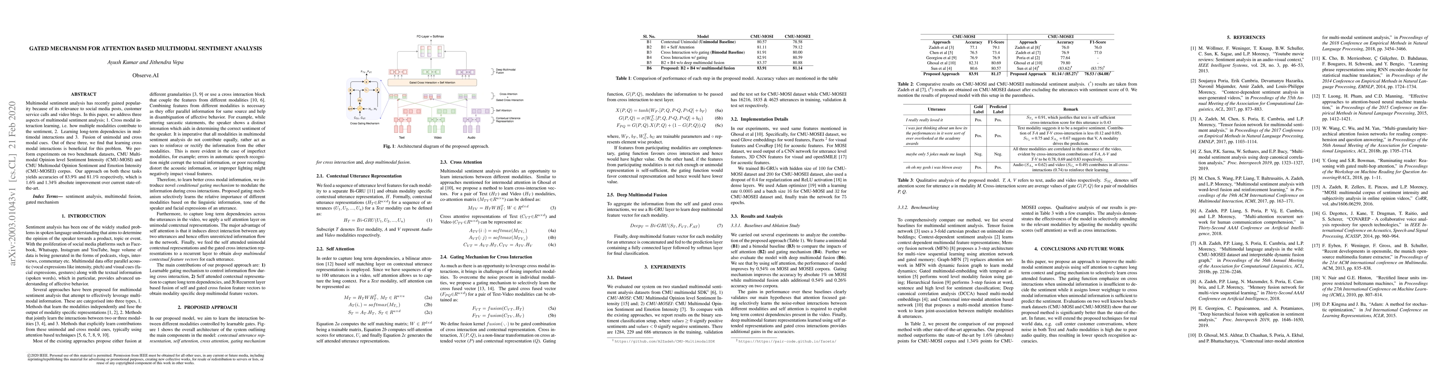 This paper proposes a gated mechanism for attention-based multimodal sentiment analysis, focusing on cross modal interaction learning, long-term dependencies, and fusion of cues. Experiments on CMU-MOSI and CMU-MOSEI datasets show an improvement of 1.6% and 1.34% over the state-of-the-art, respectively.