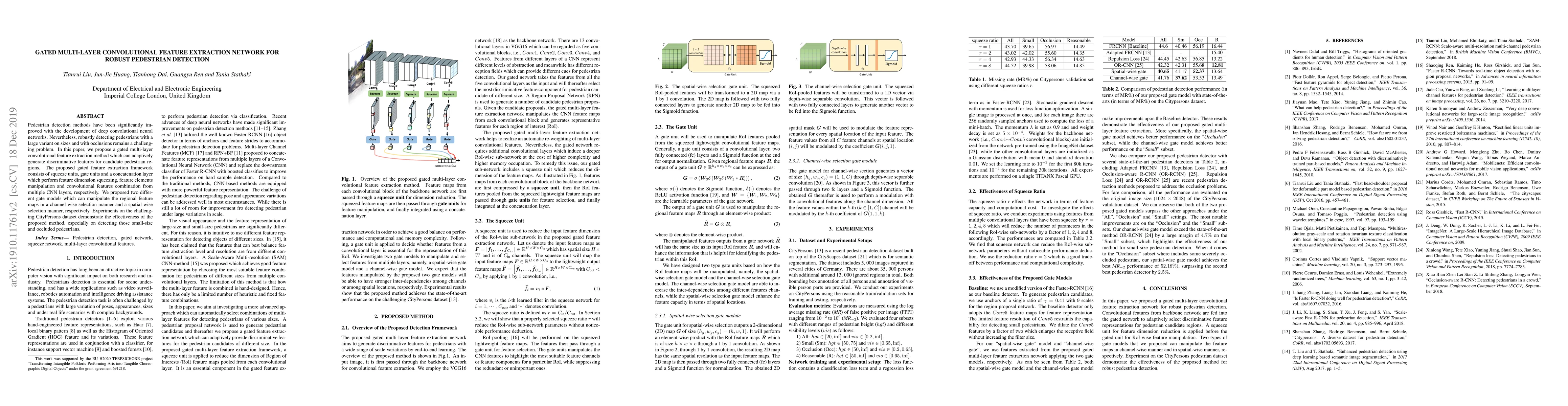 A new pedestrian detection method uses a gated multi-layer convolutional feature extraction network to adaptively generate discriminative features for candidate regions, improving accuracy on small and occluded pedestrians.