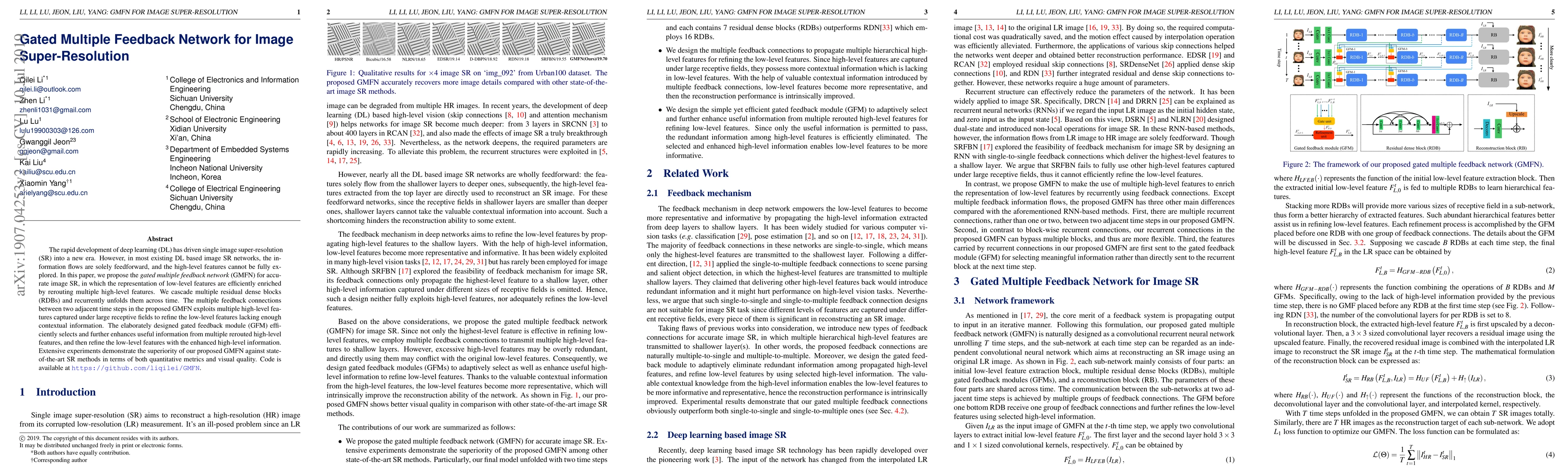 This paper proposes a Gated Multiple Feedback Network (GMFN) for image super-resolution, utilizing recurrent unfolding of residual dense blocks to enrich low-level features through multiple high-level feedback connections. The gated feedback module selects and enhances useful information, leading to superior performance compared to state-of-the-art methods.