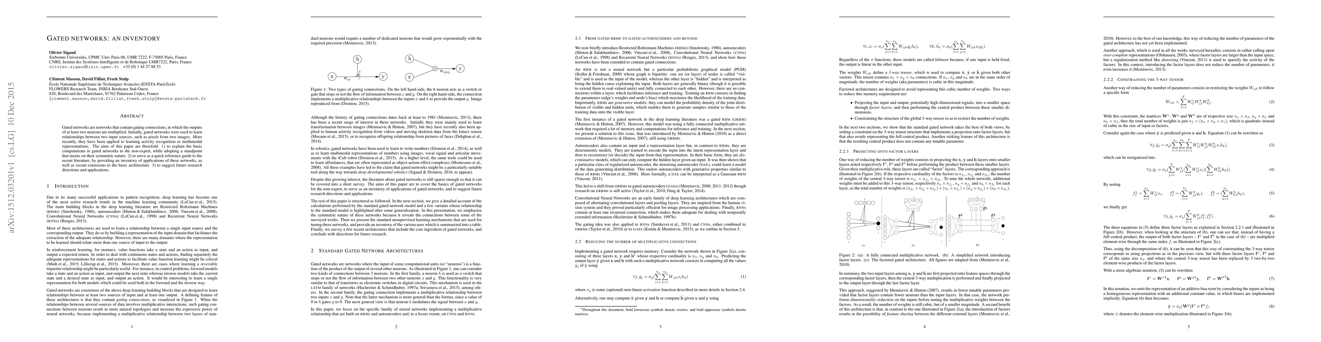 Gated networks are networks that contain gating connections, in which the outputs of at least two neurons are multiplied. Initially, gated networks were used to learn relationships between two input sources, such as pixels from two images. More recently, they have been applied to learning activity recognition or multi-modal representations. The aims of this paper are threefold: 1) to explain the basic computations in gated networks to the non-expert, while adopting a standpoint that insists on their symmetric nature. 2) to serve as a quick reference guide to the recent literature, by providing an inventory of applications of these networks, as well as recent extensions to the basic architecture. 3) to suggest future research directions and applications.