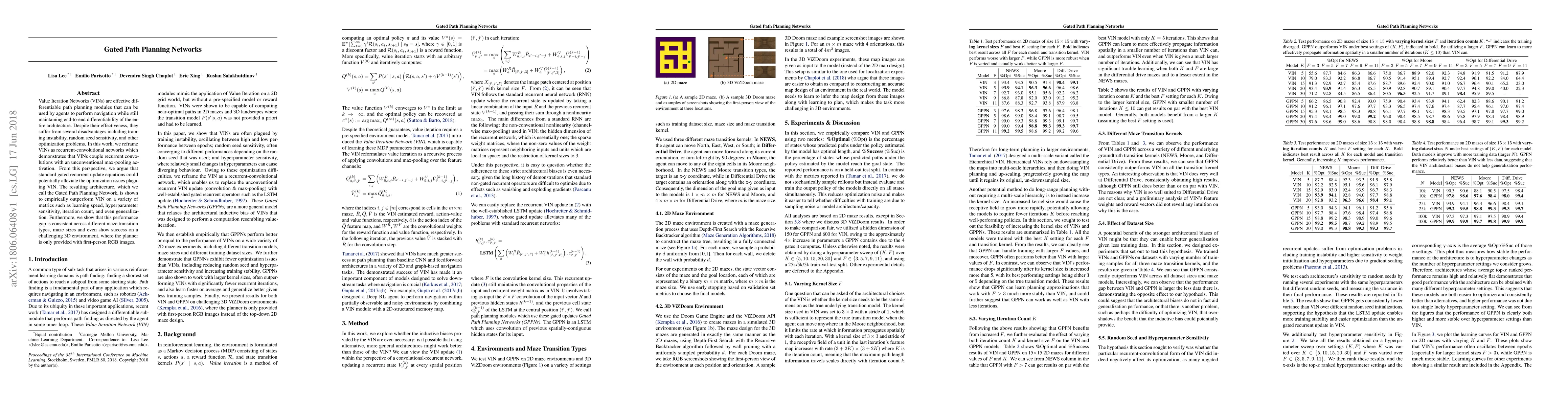 The Gated Path Planning Network reframes Value Iteration Networks to address their training instability and optimization issues, using standard gated recurrent update equations. This new architecture outperforms VIN in learning speed, hyperparameter sensitivity, and generalization across various maze types and a 3D environment.