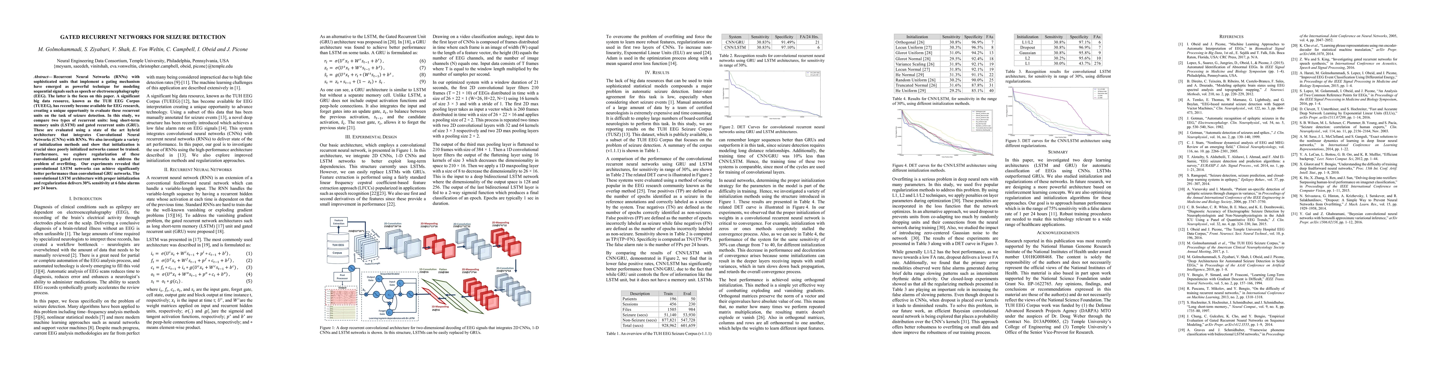 This paper evaluates LSTM and GRU units for seizure detection using EEG data from the TUH EEG Corpus, employing a hybrid CNN-RNN architecture. Results show that convolutional LSTM networks outperform GRU networks, achieving 30% sensitivity with 6 false alarms per 24 hours, highlighting the importance of proper initialization and regularization.