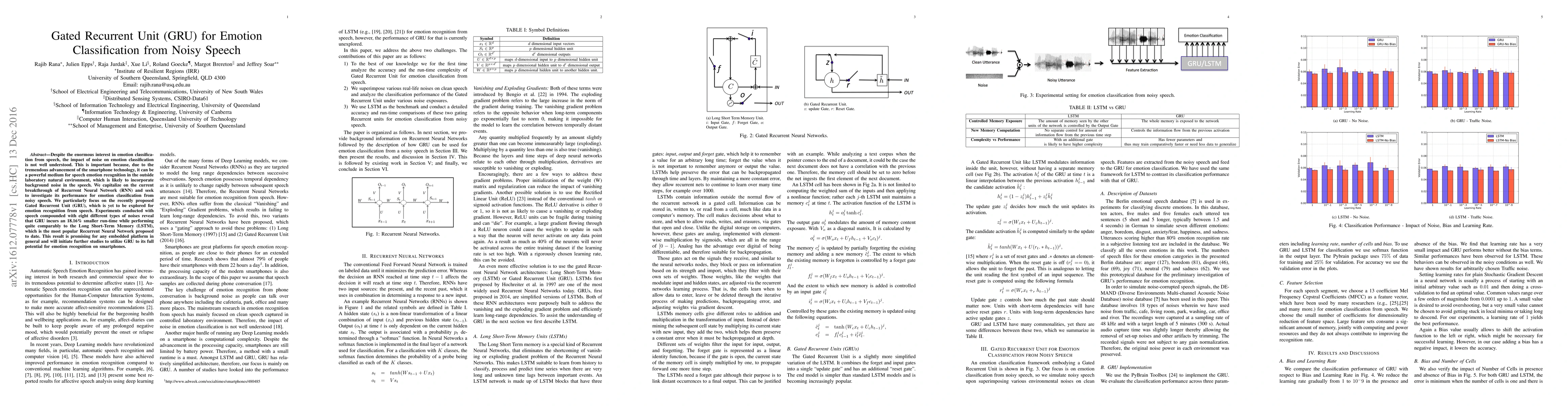 This paper explores the use of Gated Recurrent Units (GRU) for emotion classification in noisy speech, demonstrating that GRU performs comparably to LSTM while requiring 18.16% less runtime. The findings suggest GRU's potential for efficient emotion recognition in noisy environments typical of smartphone applications.