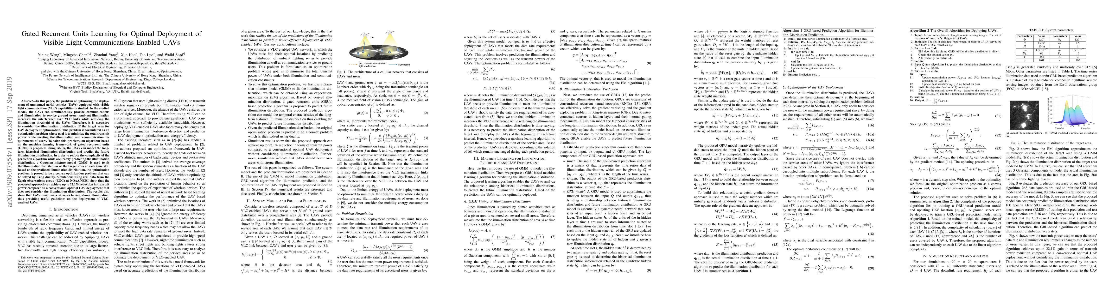 This paper proposes a GRU-based machine learning algorithm to optimize the deployment of UAVs equipped with VLC capabilities, aiming to minimize transmit power while meeting illumination and communication requirements. Simulations demonstrate a 22.1% reduction in transmit power compared to conventional methods, highlighting the importance of considering ambient illumination for effective UAV deployment.