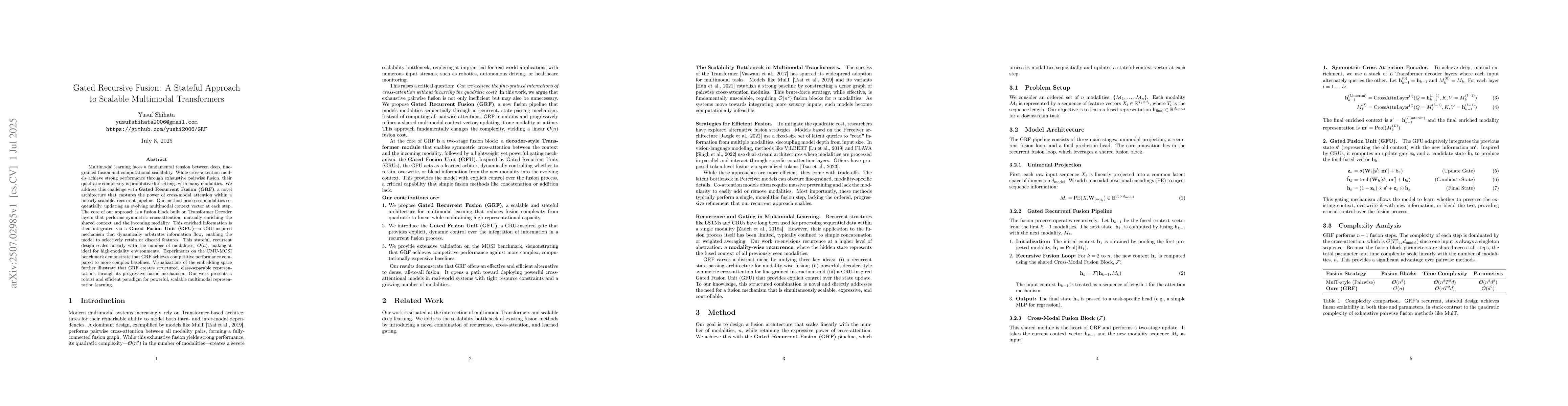 The paper introduces Gated Recurrent Fusion (GRF), a sequential, stateful fusion mechanism for multimodal learning that uses a Transformer Decoder-inspired cross-attention mechanism within a linearly scalable, recurrent pipeline. It processes modalities sequentially, updating a context vector at each step, and integrates information via a Gated Fusion Unit (GFU) that dynamically controls information flow.