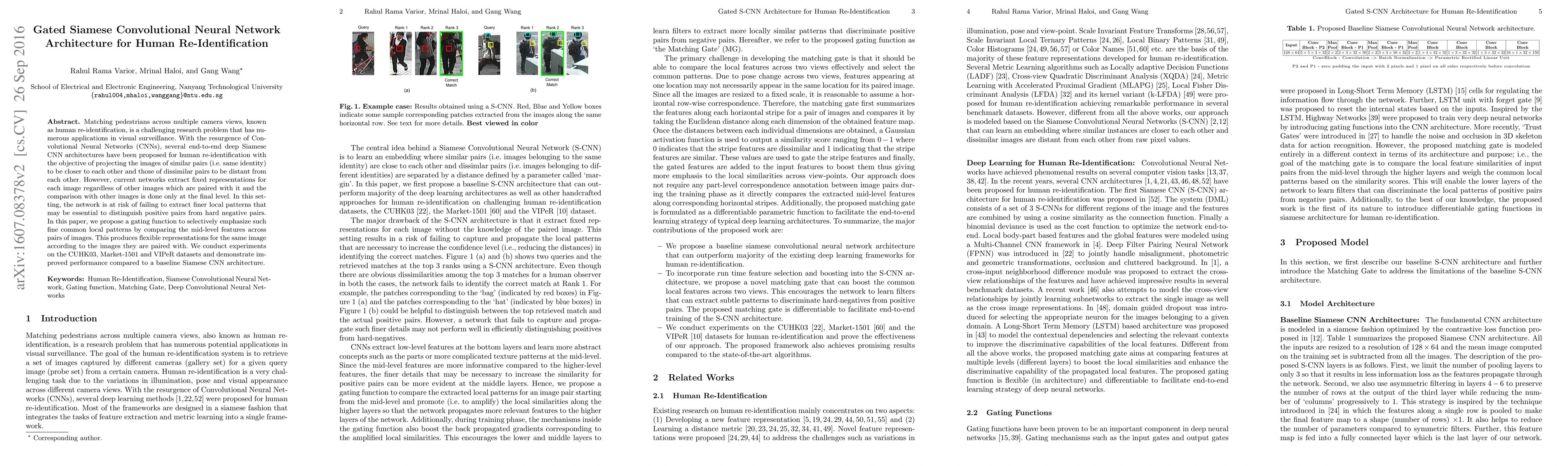 This paper proposes a Gated Siamese Convolutional Neural Network to enhance human re-identification by emphasizing fine local patterns through a gating function that dynamically adjusts mid-level feature comparisons. Experiments on multiple datasets show improved performance over traditional Siamese CNN architectures.