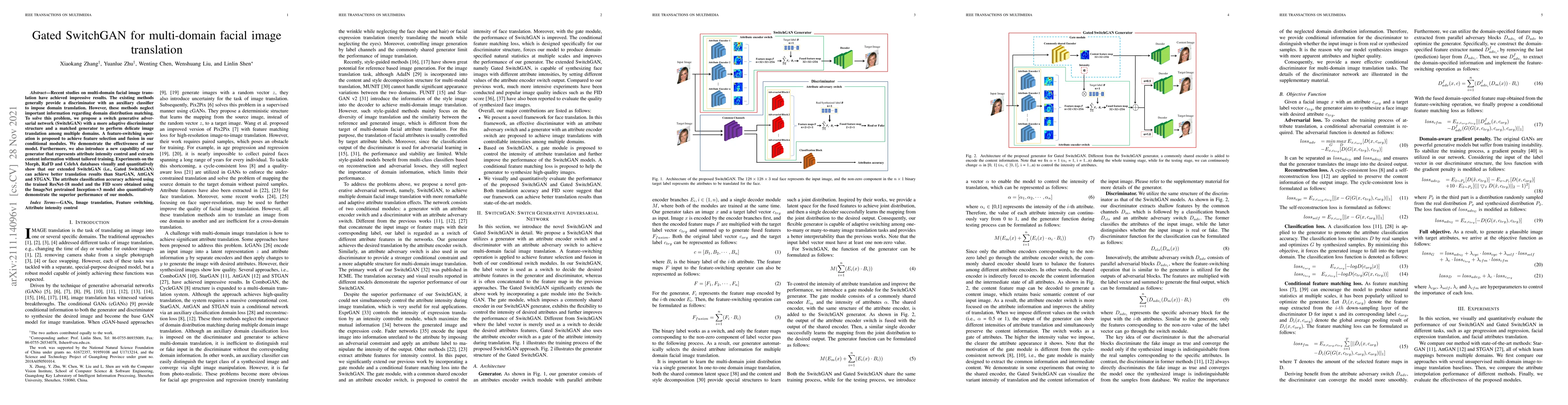 The paper proposes Gated SwitchGAN, a Generative Adversarial Network (GAN) for multi-domain facial image translation. It addresses the limitation of existing methods by incorporating a more adaptive discriminator and a matched generator for precise image translation. Gated SwitchGAN introduces a feature-switching operation for feature selection and fusion, and offers attribute intensity control and content information extraction without tailored training. Experiments on Morph, RaFD, and CelebA databases demonstrate superior performance over StarGAN, AttGAN, and STGAN, as evidenced by visual and quantitative results, including higher attribute classification accuracy and lower FID scores.