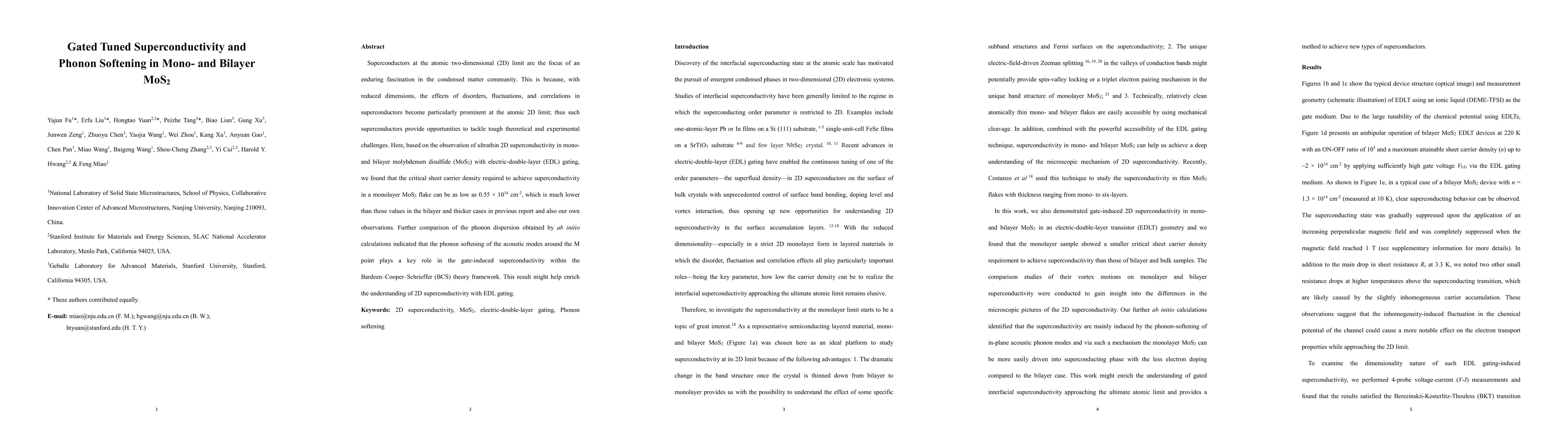 Superconductors at the atomic two-dimensional (2D) limit are the focus of an enduring fascination in the condensed matter community. This is because, with reduced dimensions, the effects of disorders, fluctuations, and correlations in superconductors become particularly prominent at the atomic 2D limit; thus such superconductors provide opportunities to tackle tough theoretical and experimental challenges. Here, based on the observation of ultrathin 2D superconductivity in mono- and bilayer molybdenum disulfide (MoS$_2$) with electric-double-layer (EDL) gating, we found that the critical sheet carrier density required to achieve superconductivity in a monolayer MoS$_2$ flake can be as low as 0.55*10$^{14}$cm$^{-2}$, which is much lower than those values in the bilayer and thicker cases in previous report and also our own observations. Further comparison of the phonon dispersion obtained by ab initio calculations indicated that the phonon softening of the acoustic modes around the M point plays a key role in the gate-induced superconductivity within the Bardeen-Cooper Schrieffer (BCS) theory framework. This result might help enrich the understanding of 2D superconductivity with EDL gating.