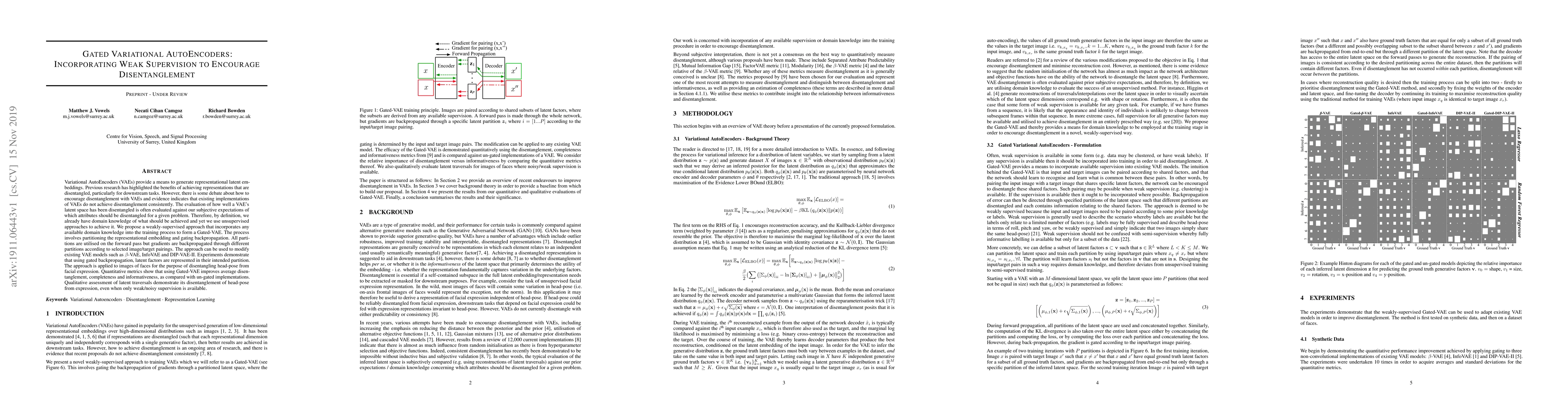 This paper proposes a Gated Variational AutoEncoder (Gated-VAE) to enhance disentanglement in latent representations by incorporating weak supervision. The method partitions the latent space and gates backpropagation based on available domain knowledge, improving disentanglement of head-pose from facial expression in image datasets.