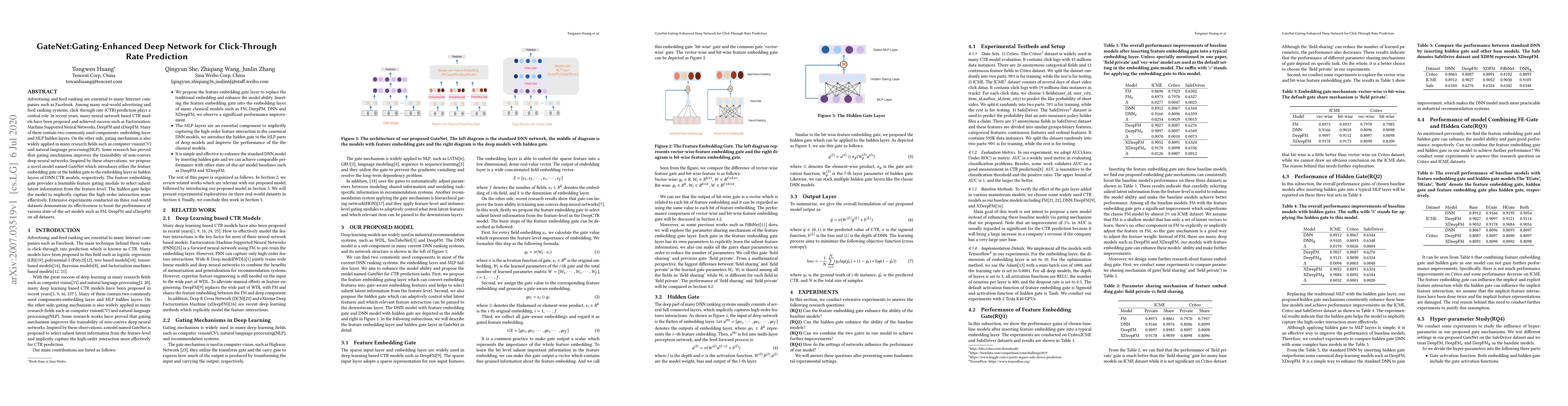 GateNet introduces gating mechanisms to enhance deep neural networks for click-through rate prediction, improving performance over models like DeepFM and xDeepFM. Experiments show significant gains across multiple datasets.