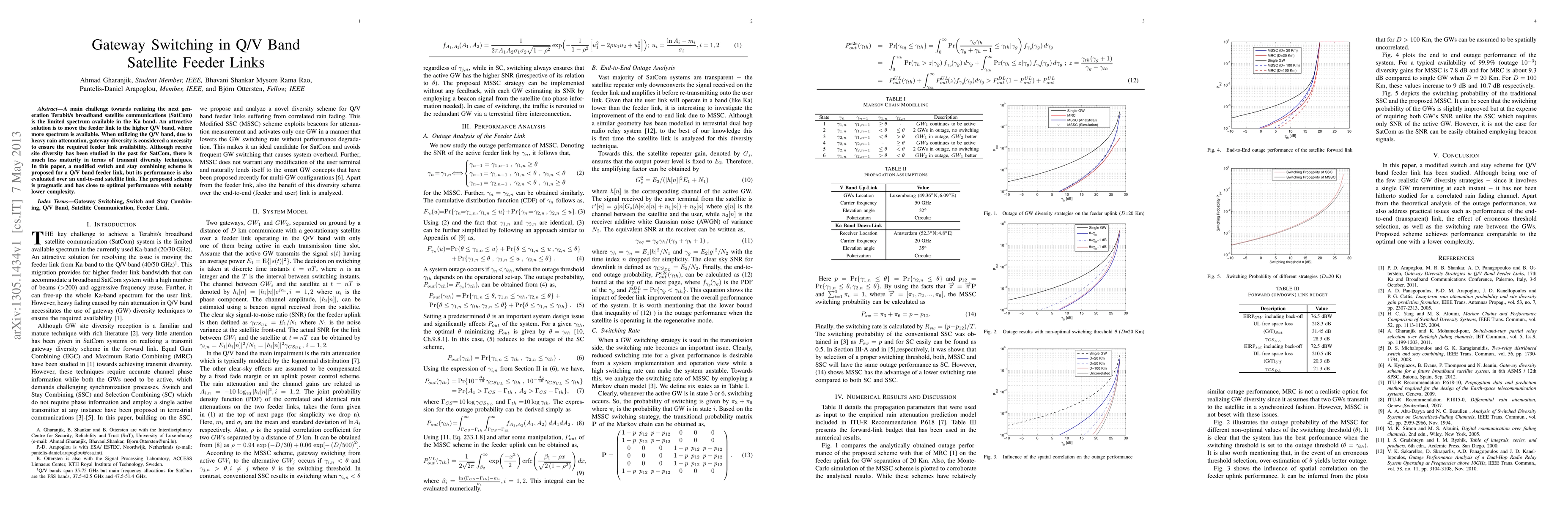 A main challenge towards realizing the next generation Terabit/s broadband satellite communications (SatCom) is the limited spectrum available in the Ka band. An attractive solution is to move the feeder link to the higher Q/V band, where more spectrum is available. When utilizing the Q/V band, due to heavy rain attenuation, gateway diversity is considered a necessity to ensure the required feeder link availability. Although receive site diversity has been studied in the past for SatCom, there is much less maturity in terms of transmit diversity techniques. In this paper, a modified switch and stay combining scheme is proposed for a Q/V band feeder link, but its performance is also evaluated over an end-to-end satellite link. The proposed scheme is pragmatic and has close to optimal performance with notably lower complexity.