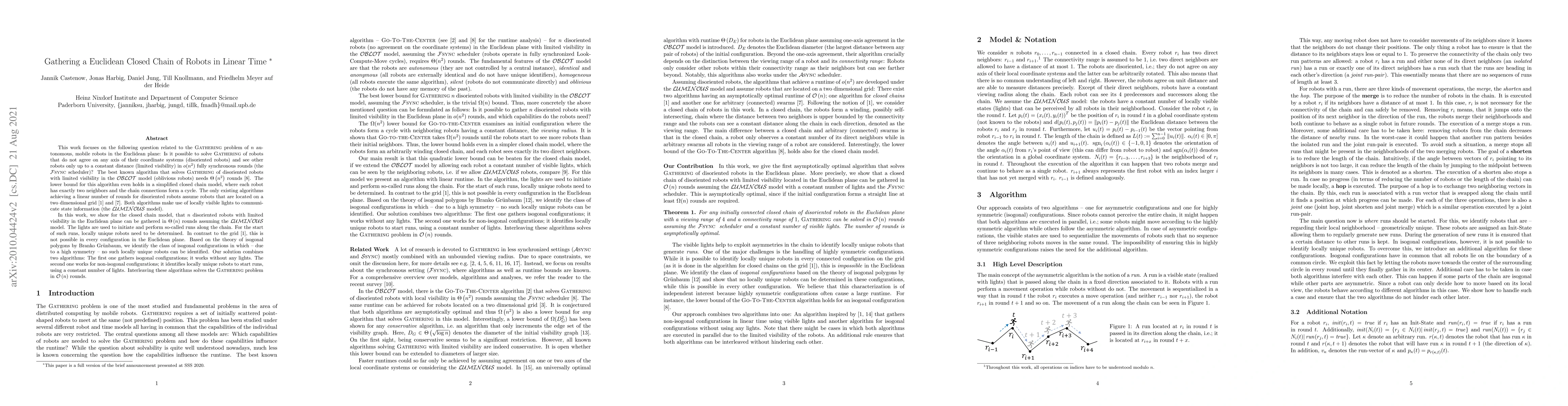 This work focuses on the following question related to the Gathering problem of $n$ autonomous, mobile robots in the Euclidean plane: Is it possible to solve Gathering of robots that do not agree on any axis of their coordinate systems (disoriented robots) and see other robots only up to a constant distance (limited visibility) in $o(n^2)$ fully synchronous rounds? The best known algorithm that solves Gathering of disoriented robots with limited visibility assuming oblivious robots needs $\Theta(n^2)$ rounds [SPAA'11]. The lower bound for this algorithm even holds in a simplified closed chain model, where each robot has exactly two neighbors and the chain connections form a cycle. The only existing algorithms achieving a linear number of rounds for disoriented robots assume robots that are located on a two dimensional grid [IPDPS'16] and [SPAA'16]. Both algorithms make use of locally visible lights (the LUMINOUS model). In this work, we show for the closed chain model, that $n$ disoriented robots with limited visibility in the Euclidean plane can be gathered in $\Theta\left(n\right)$ rounds assuming the LUMINOUS model. The lights are used to initiate and perform so-called runs along the chain. For the start of such runs, locally unique robots need to be determined. In contrast to the grid [IPDPS'16], this is not possible in every configuration in the Euclidean plane. Based on the theory of isogonal polygons by Gr\"unbaum, we identify the class of isogonal configurations in which no such locally unique robots can be identified. Our solution combines two algorithms: The first one gathers isogonal configurations; it works without any lights. The second one works for non-isogonal configurations; it identifies locally unique robots to start runs, using a constant number of lights. Interleaving these algorithms solves the Gathering problem in $\mathcal{O}(n)$ rounds.