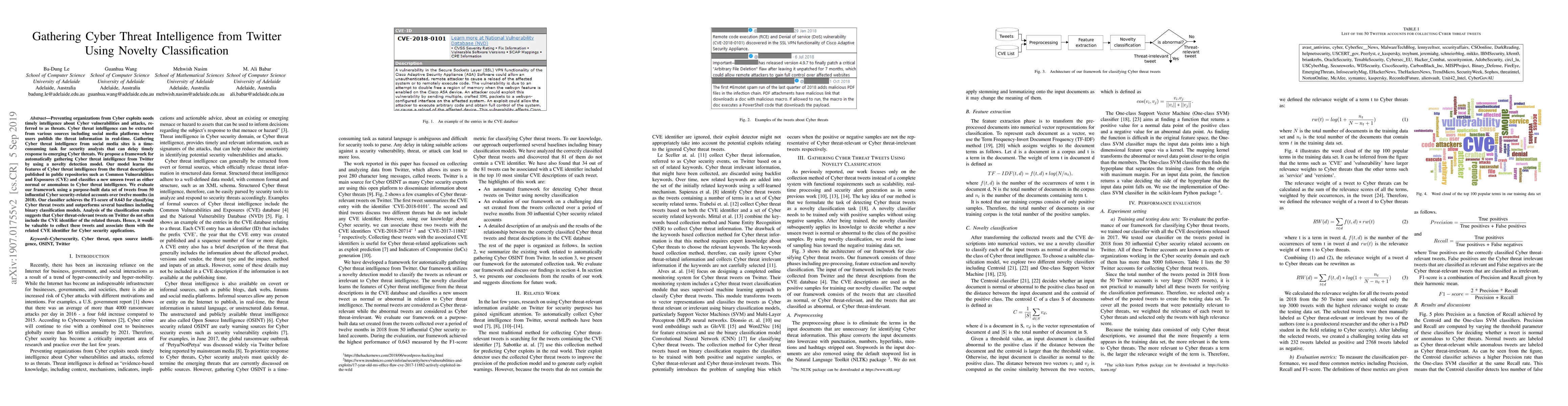 This paper proposes a framework for automatically extracting cyber threat intelligence from Twitter using a novelty detection model. The model classifies tweets as normal or anomalous to cyber threats, achieving an F1-score of 0.643, and outperforms baseline classifiers. The study highlights the importance of associating identified threat tweets with relevant CVE identifiers for better cybersecurity applications.