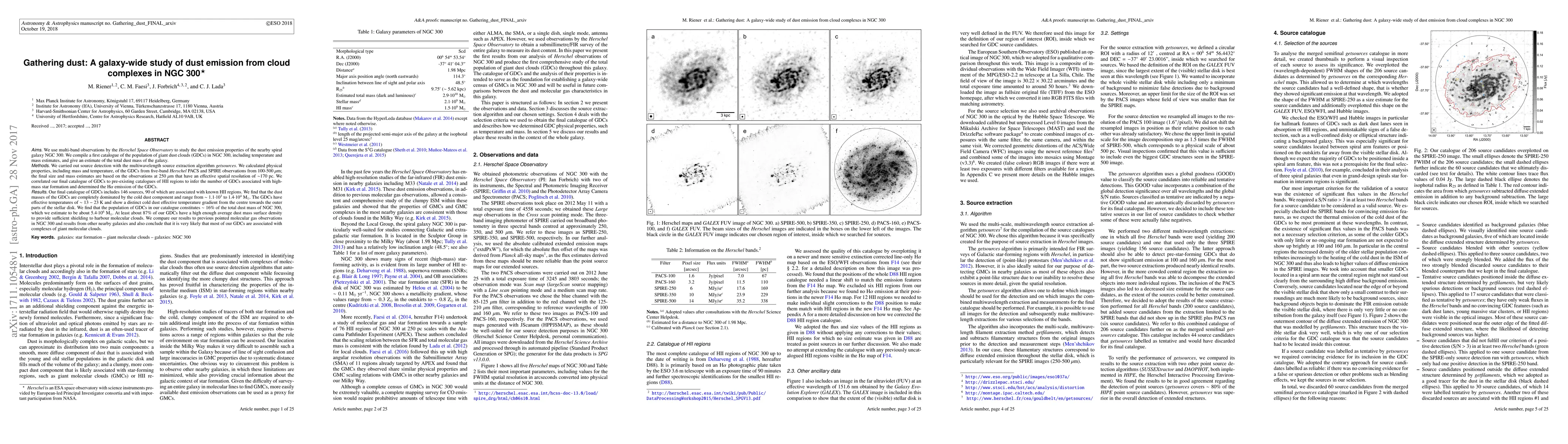 We used multi-band observations by the Herschel Space Observatory to study the dust emission properties of the nearby spiral galaxy NGC 300. We compiled a first catalogue of the population of giant dust clouds (GDCs) in NGC 300 and give an estimate of the total dust mass of the galaxy. We carried out source detection with the multiwavelength source extraction algorithm getsources and calculated physical properties of the GDCs, including mass and temperature, from five-band Herschel PACS and SPIRE observations from 100-500 $\mu$m; the final size and mass estimates are based on the observations at 250 $\mu$m that have an effective spatial resolution of $\sim$170 pc. We correlated our final catalogue of GDCs to pre-existing catalogues of HII regions to infer the number of GDCs associated with high-mass star formation and determined the H$\alpha$ emission of the GDCs. Our final catalogue of GDCs includes 146 sources, 90 of which are associated with known HII regions. We find that the dust masses of the GDCs are completely dominated by the cold dust component and range from $\sim$1.1$\cdot$10$^{3}$ - 1.4$\cdot$10$^{4}$ M$_{\odot}$. The GDCs have effective temperatures of $\sim$13-23 K and show a distinct cold dust effective temperature gradient from the centre towards the outer parts of the stellar disk. We find that the population of GDCs in our catalogue constitutes $\sim$16% of the total dust mass of NGC 300, which we estimate to be about 5.4$\cdot$10$^{6}$ M$_{\odot}$. At least about 87% of our GDCs have a high enough average dust mass surface density to provide sufficient shielding to harbour molecular clouds. We compare our results to previous pointed molecular gas observations in NGC 300 and results from other nearby galaxies and also conclude that it is very likely that most of our GDCs are associated with complexes of giant molecular clouds.
