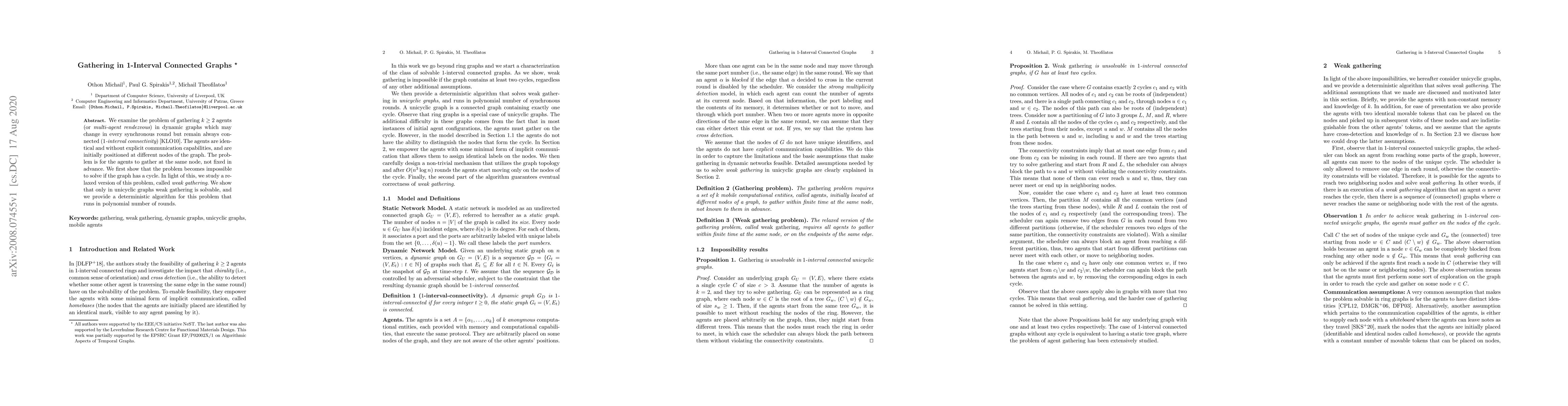 We examine the problem of gathering $k \geq 2$ agents (or multi-agent rendezvous) in dynamic graphs which may change in every synchronous round but remain always connected ($1$-interval connectivity) [KLO10]. The agents are identical and without explicit communication capabilities, and are initially positioned at different nodes of the graph. The problem is for the agents to gather at the same node, not fixed in advance. We first show that the problem becomes impossible to solve if the graph has a cycle. In light of this, we study a relaxed version of this problem, called weak gathering. We show that only in unicyclic graphs weak gathering is solvable, and we provide a deterministic algorithm for this problem that runs in polynomial number of rounds.