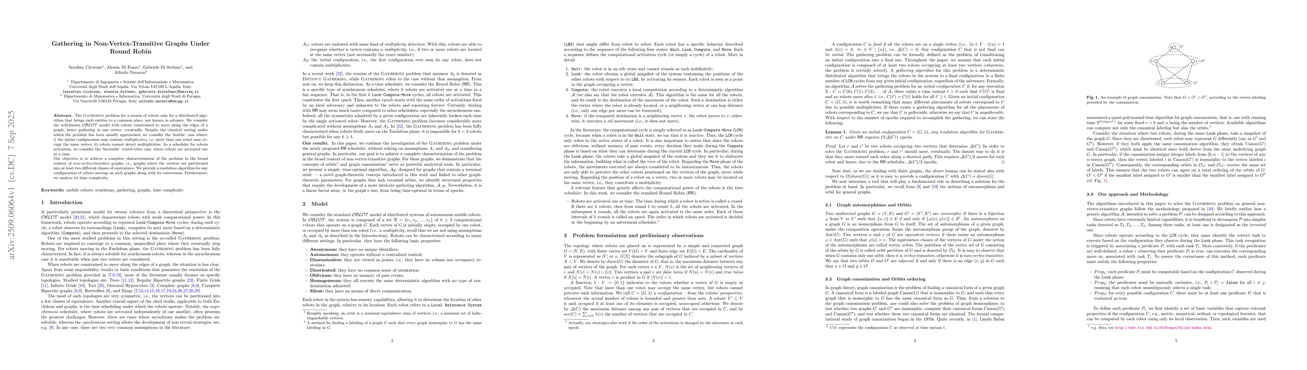 The Gathering problem for a swarm of robots asks for a distributed algorithm that brings such entities to a common place, not known in advance. We consider the well-known OBLOT model with robots constrained to move along the edges of a graph, hence gathering in one vertex, eventually. Despite the classical setting under which the problem has been usually approached, we consider the `hostile' case where: i) the initial configuration may contain multiplicities, i.e. more than one robot may occupy the same vertex; ii) robots cannot detect multiplicities. As a scheduler for robot activation, we consider the "favorable" round-robin case, where robots are activated one at a time. Our objective is to achieve a complete characterization of the problem in the broad context of non-vertex-transitive graphs, i.e., graphs where the vertices are partitioned into at least two different classes of equivalence. We provide a resolution algorithm for any configuration of robots moving on such graphs, along with its correctness. Furthermore, we analyze its time complexity.