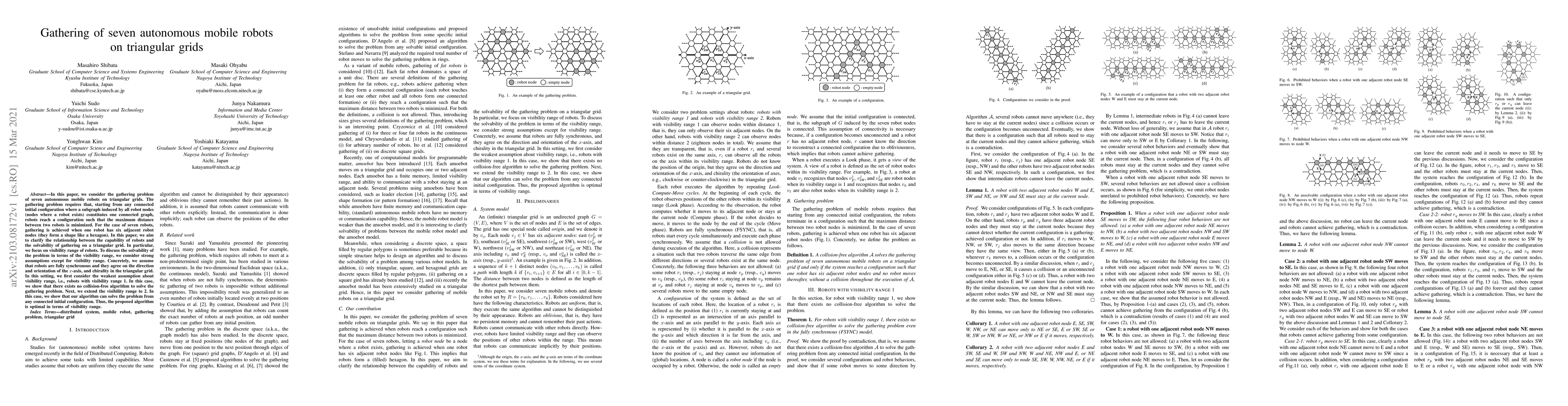 This paper investigates the gathering problem for seven autonomous mobile robots on triangular grids, focusing on the relationship between robot visibility range and solvability. It demonstrates that with a visibility range of 1, no collision-free solution exists, but extending the range to 2 allows a solution from any connected initial configuration, proving the algorithm's optimality.