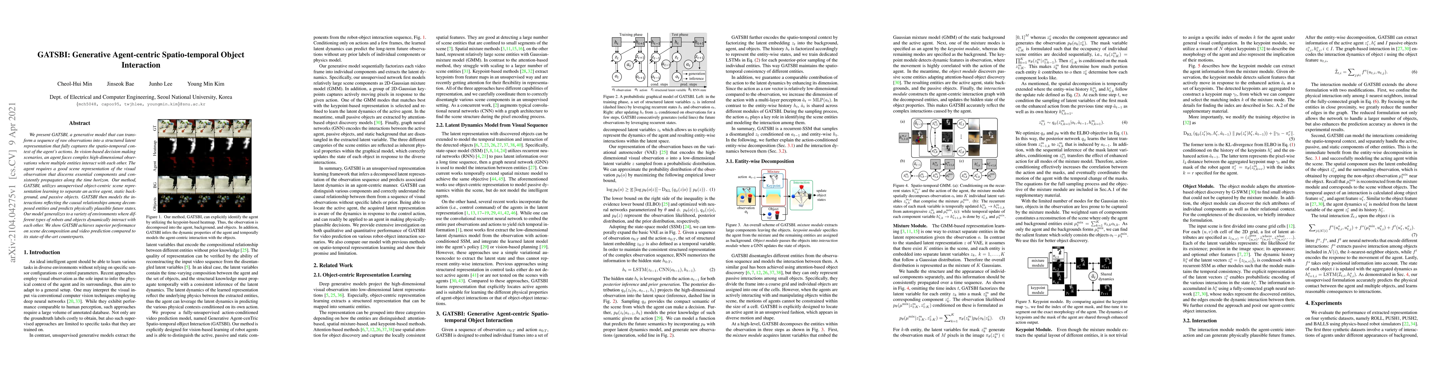 GATSBI is a generative model that transforms raw observations into a structured latent representation capturing agent-centric spatio-temporal interactions. It excels in vision-based decision-making by decomposing scenes into active agents, static backgrounds, and passive objects, and predicting future states based on causal interactions.