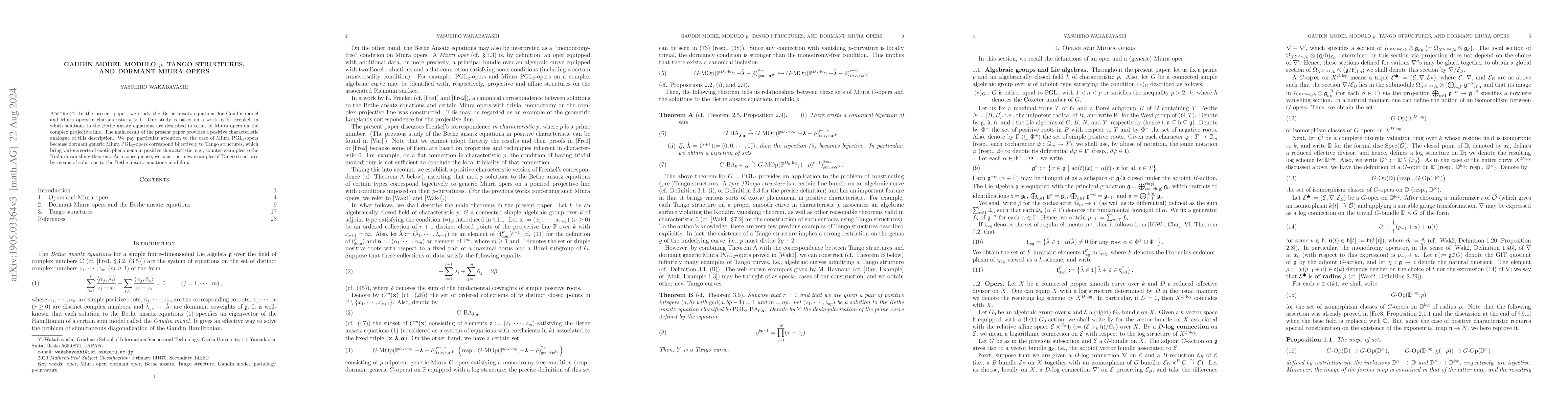 In the present paper, we study the Bethe ansatz equations for Gaudin model and Miura opers in characteristic $p>0$. Our study is based on a work by E. Frenkel, in which solutions to the Bethe ansatz equations are described in terms of Miura opers on the complex projective line. The main result of the present paper provides a positive characteristic analogue of this description. We pay particular attention to the case of Miura $\mathrm{PGL}_2$-opers because dormant generic Miura $\mathrm{PGL}_2$-opers correspond bijectively to Tango structures, which bring various sorts of pathological phenomena in positive characteristic (e.g., counter-examples to the Kodaira vanishing theorem). As a consequence, we can construct new examples of Tango structures by means of solutions to the Bethe ansatz equations modulo $p$.
