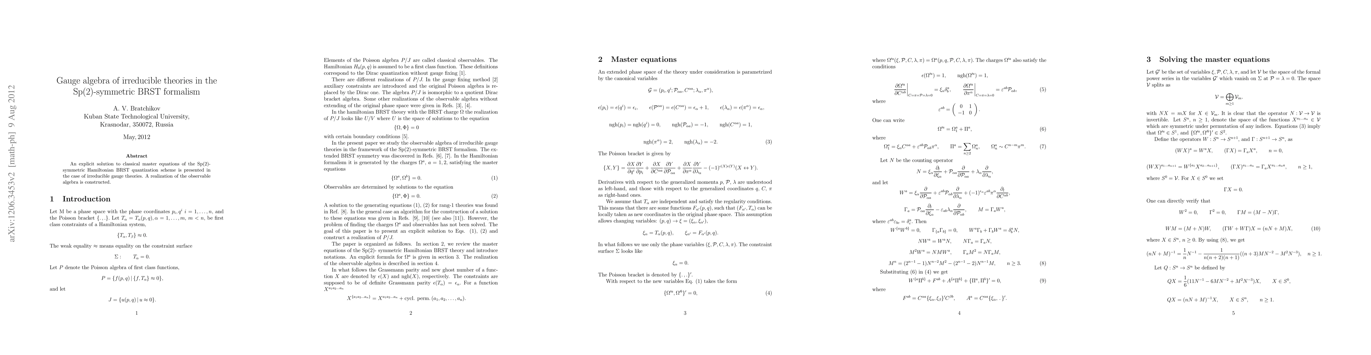An explicit solution to classical master equations of the Sp(2)-symmetric Hamiltonian BRST quantization scheme is presented in the case of irreducible gauge theories. A realization of the observable algebra is constructed.