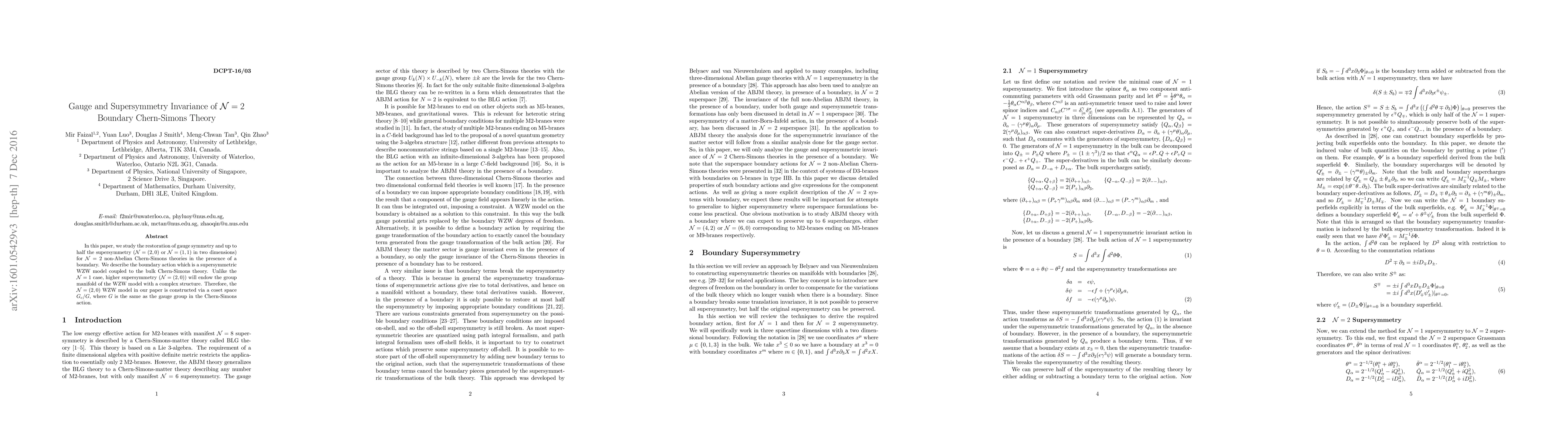 This paper explores the gauge and supersymmetry invariance of N=2 Chern-Simons theories on a boundary, showing that higher supersymmetry (N=(2,0)) introduces a complex structure on the group manifold via a coset space construction. The boundary action combines a supersymmetric WZW model with the bulk Chern-Simons theory.
