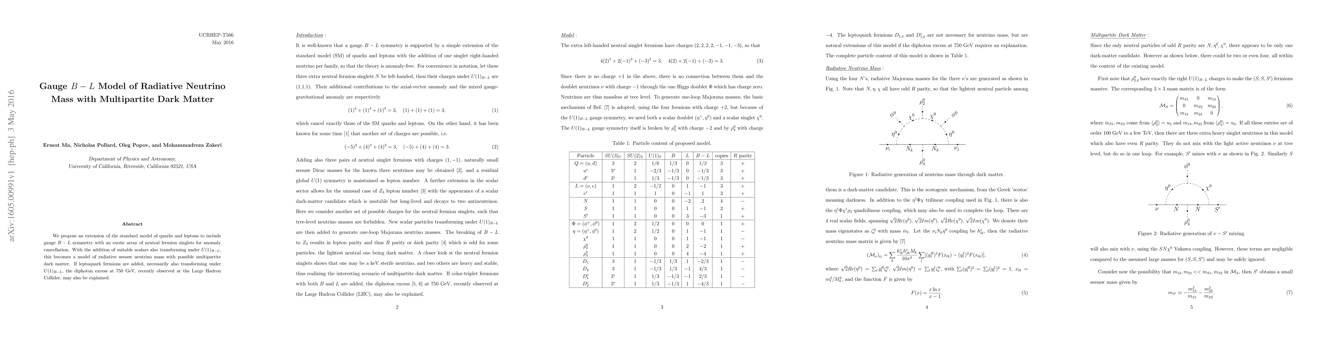This paper proposes an extended standard model incorporating gauge $B-L$ symmetry and neutral fermion singlets for anomaly cancellation, leading to a radiative seesaw mechanism for neutrino mass and potential multipartite dark matter. The inclusion of leptoquark fermions may also explain the observed diphoton excess at 750 GeV.