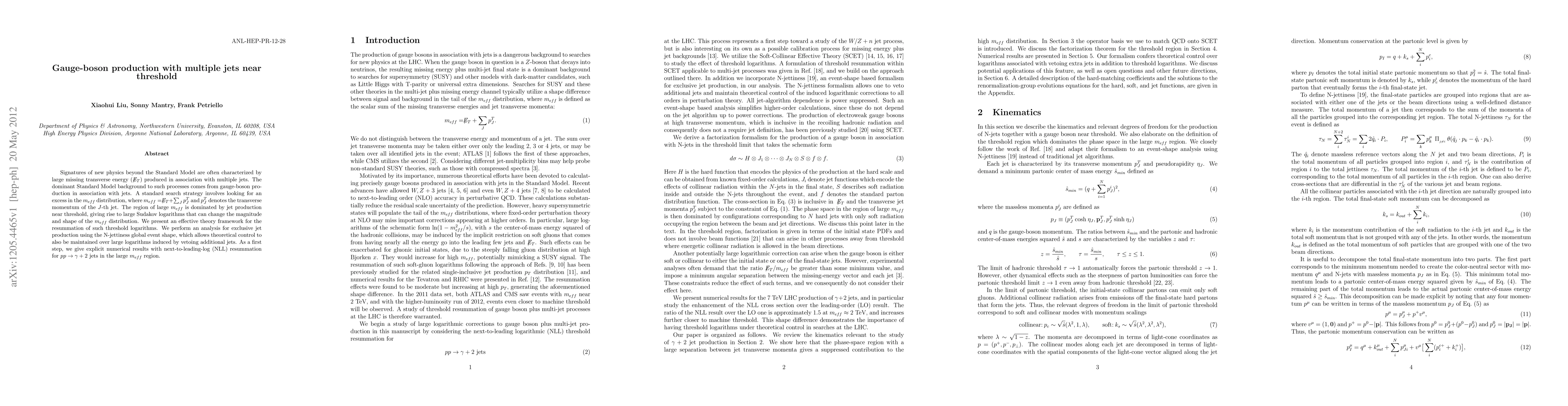 Signatures of new physics beyond the Standard Model are often characterized by large missing transverse energy ($\not E_T$) produced in association with multiple jets. The dominant Standard Model background to such processes comes from gauge-boson production in association with jets. A standard search strategy involves looking for an excess in the $m_{eff}$ distribution, where $m_{eff}= \not E_T +\sum_{J} p^T_J$ and $p^T_J$ denotes the transverse momentum of the $J$-th jet. The region of large $m_{eff}$ is dominated by jet production near threshold, giving rise to large Sudakov logarithms that can change the magnitude and shape of the $m_{eff}$ distribution. We present an effective theory framework for the resummation of such threshold logarithms. We perform an analysis for exclusive jet production using the N-jettiness global event shape, which allows theoretical control to also be maintained over large logarithms induced by vetoing additional jets. As a first step, we give explicit numerical results with next-to-leading-log (NLL) resummation for $pp \to \gamma + 2$ jets in the large $m_{eff}$ region.