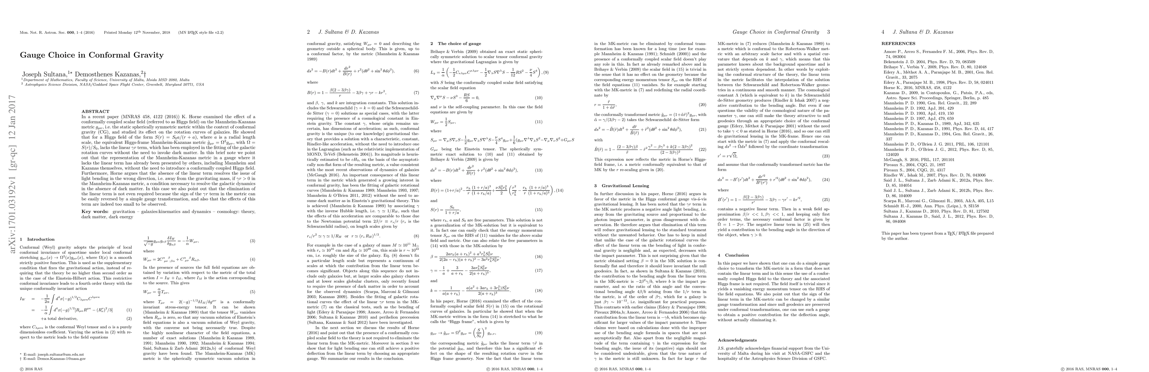 The paper demonstrates that a simple gauge transformation can eliminate the linear term in the Mannheim-Kazanas metric, challenging the previous attribution of this effect to a conformally coupled Higgs field.