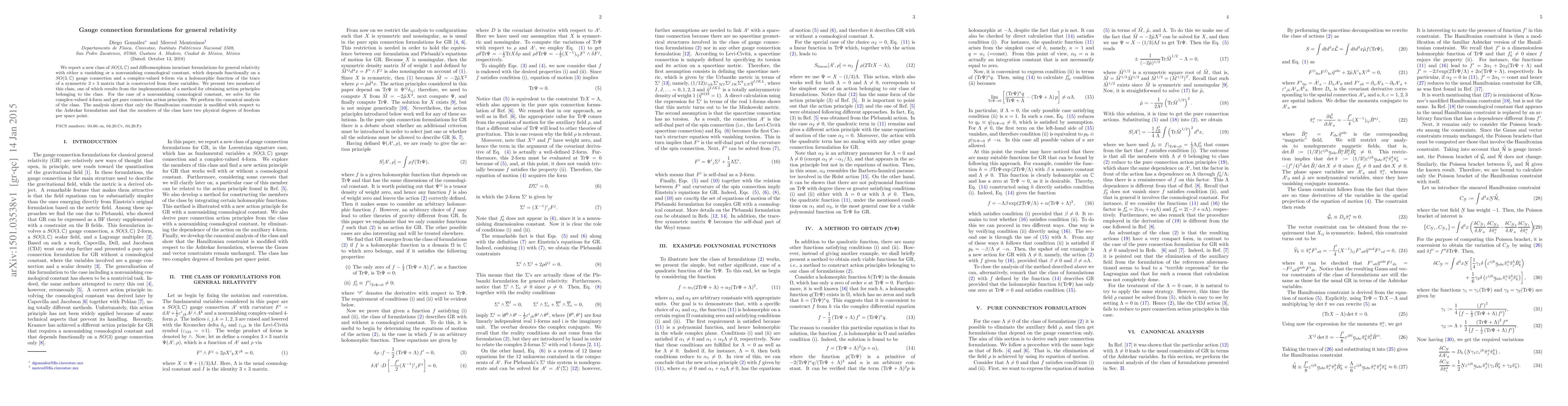 We report a new class of $SO(3,\mathbb{C})$ and diffeomorphism invariant formulations for general relativity with either a vanishing or a nonvanishing cosmological constant, which depends functionally on a $SO(3,\mathbb{C})$ gauge connection and a complex-valued 4-form via a holomorphic function of the trace of a symmetric $3\times3$ matrix that is constructed from these variables. We present two members of this class, one of which results from the implementation of a method for obtaining action principles belonging to the class. For the case of a nonvanishing cosmological constant, we solve for the complex-valued 4-form and get pure connection action principles. We perform the canonical analysis of the class. The analysis shows that only the Hamiltonian constraint is modified with respect to the Ashtekar formulation and that the members of the class have two physical degrees of freedom per space point.