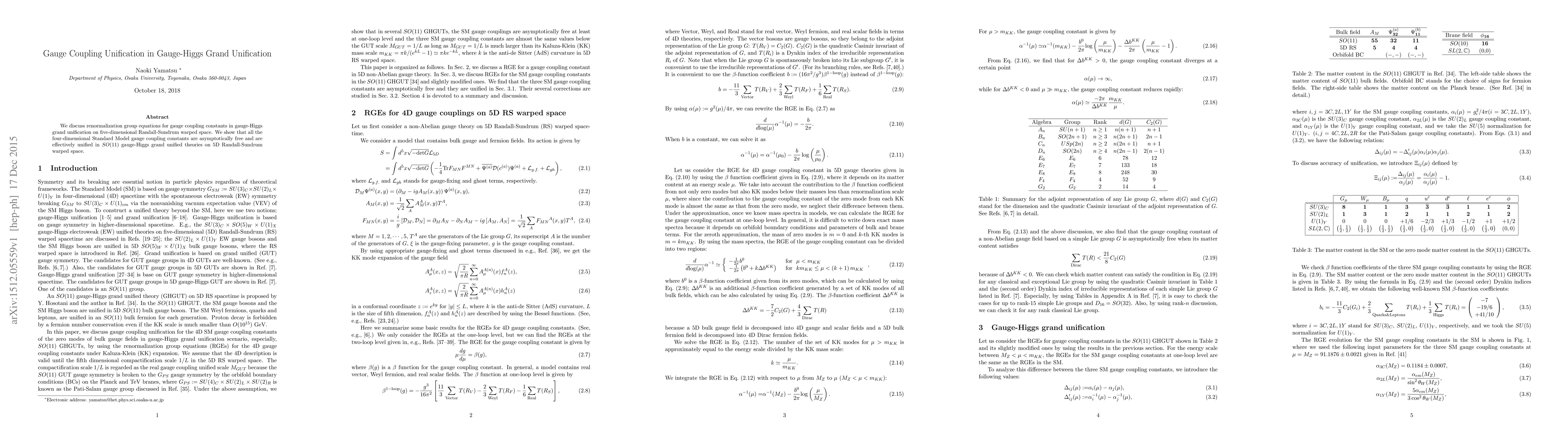 This paper explores the renormalization group equations for gauge coupling constants in gauge-Higgs grand unification within the framework of five-dimensional Randall-Sundrum warped space, demonstrating the asymptotic freedom and effective unification of Standard Model gauge couplings in $SO(11)$ theories.