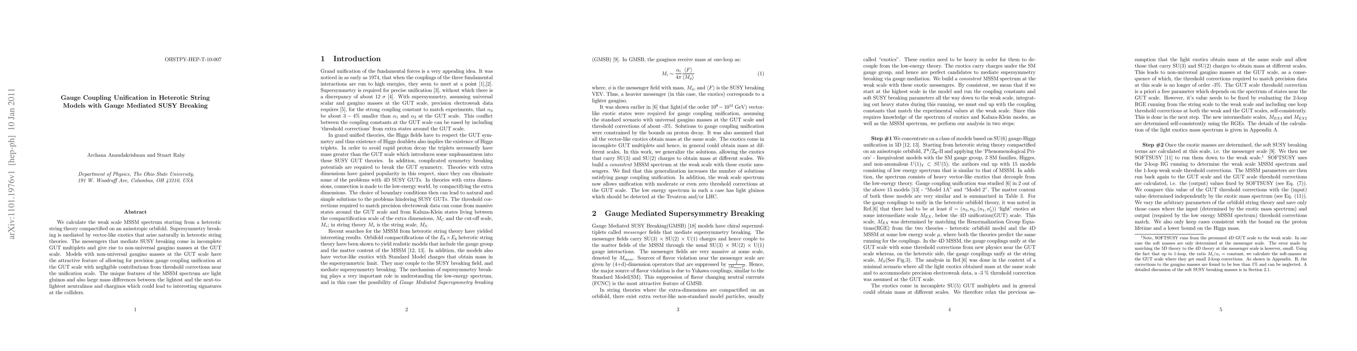 This research investigates gauge coupling unification in heterotic string models with gauge-mediated SUSY breaking, revealing a spectrum with light gluinos and significant mass differences in neutralinos and charginos, potentially yielding distinct collider signatures. The model features non-universal gaugino masses allowing precise unification without substantial threshold corrections.