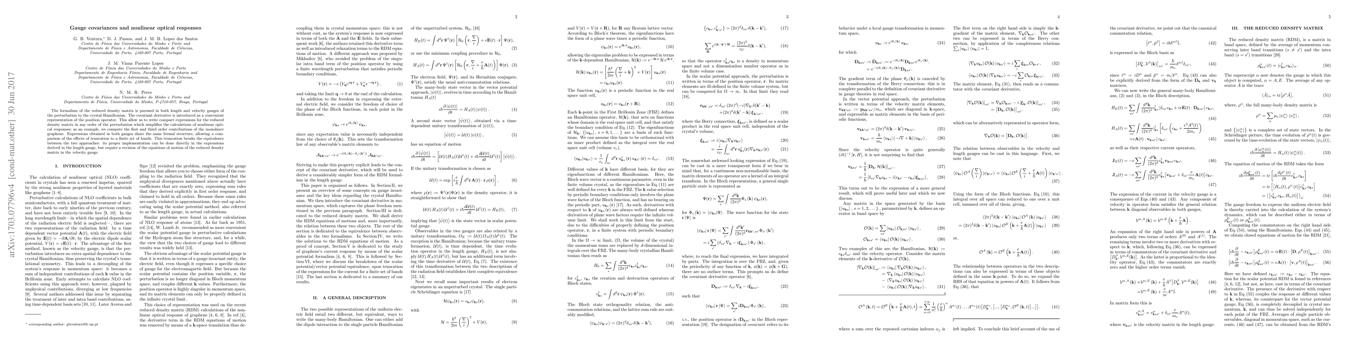 The formalism of the reduced density matrix is pursued in both length and velocity gauges of the perturbation to the crystal Hamiltonian. The covariant derivative is introduced as a convenient representation of the position operator. This allow us to write compact expressions for the reduced density matrix in any order of the perturbation which simplifies the calculations of nonlinear optical responses; as an example, we compute the first and third order contributions of the monolayer graphene. Expressions obtained in both gauges share the same formal structure, allowing a comparison of the effects of truncation to a finite set of bands. This truncation breaks the equivalence between the two approaches: its proper implementation can be done directly in the expressions derived in the length gauge, but require a revision of the equations of motion of the reduced density matrix in the velocity gauge.