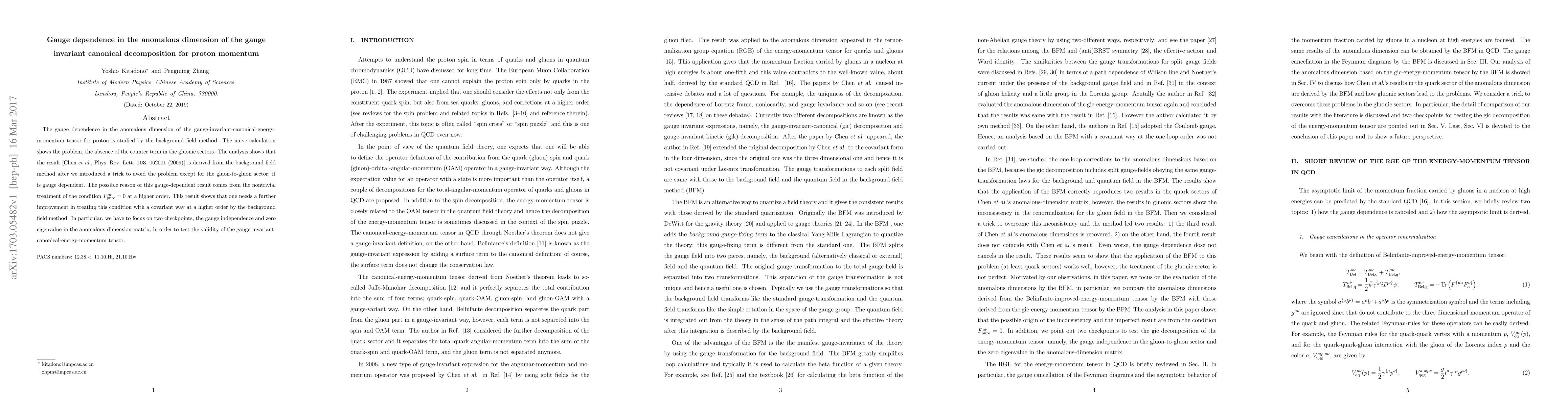 This paper investigates the gauge dependence in the anomalous dimension of the gauge-invariant-canonical-energy-momentum tensor for the proton using the background field method. It reveals that the result from a previous study is gauge dependent due to the nontrivial treatment of the condition $F^{\mu\nu}_{pure}=0$ at higher orders, necessitating further improvements in the method.