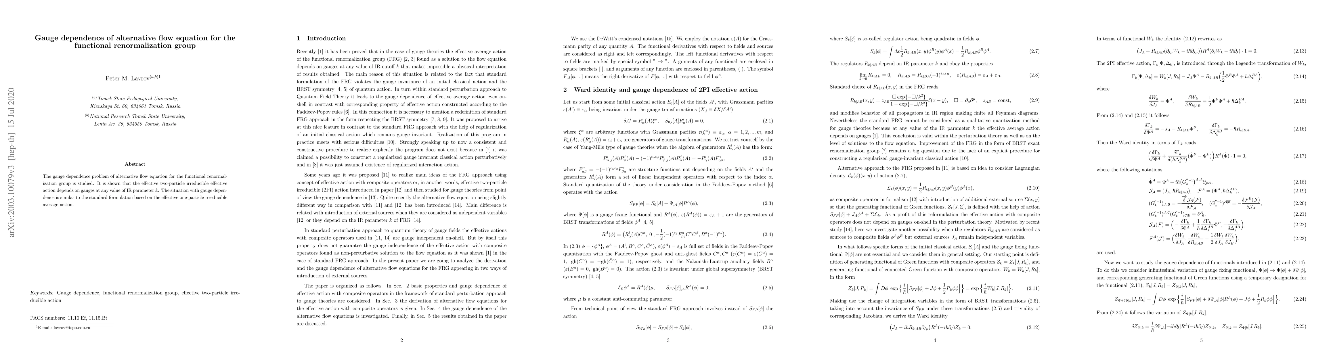The gauge dependence problem of alternative flow equation for the functional renormalization group is studied. It is shown that the effective two-particle irreducible effective action depends on gauges at any value of IR parameter $k$. The situation with gauge dependence is similar to the standard formulation based on the effective one-particle irreducible effective action.