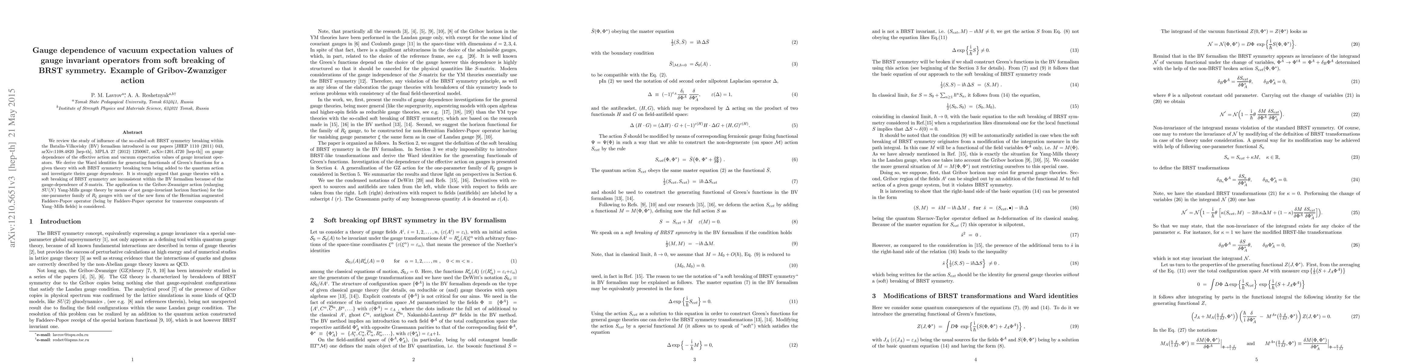 We review the study of influence of the so-called soft BRST symmetry breaking within the Batalin-Vilkovisky (BV) formalism introduced in our papers [JHEP 1110 (2011) 043, arXiv:1108.4820 [hep-th], MPLA 27 (2012) 1250067, arXiv:1201.4720 [hep-th]] on gauge dependence of the effective action and vacuum expectation values of gauge invariant operators. We derive the Ward identities for generating functionals of Green's functions for a given theory with soft BRST symmetry breaking term being added to the quantum action and investigate theirs gauge dependence. It is strongly argued that gauge theories with a soft breaking of BRST symmetry are inconsistent within the BV formalism because of the gauge-dependence of $S$-matrix. The application to the Gribov-Zwanziger action (enlarging SU(N) Yang-Mills gauge theory by means of not gauge-invariant horizon function) for the one-parameter family of $R_\xi$ gauges with use of the new form of the Hermitian augmented Faddeev-Popov operator (being by Faddeev-Popov operator for transverse components of Yang--Mills fields) is considered.