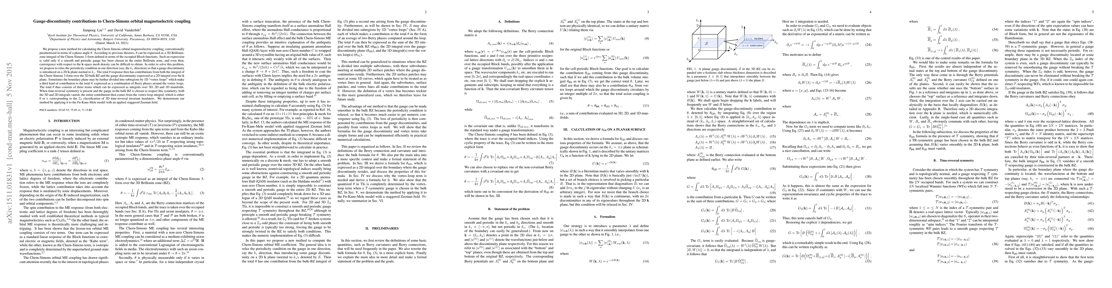We propose a new method for calculating the Chern-Simons orbital magnetoelectric coupling, conventionally parametrized in terms of a phase angle $\theta$. According to previous theories, $\theta$ can be expressed as a 3D Brillouin-zone integral of the Chern-Simons 3-form defined in terms of the occupied Bloch functions. Such an expression is valid only if a smooth and periodic gauge has been chosen in the entire Brillouin zone, and even then, convergence with respect to the $\mathbf{k}$-space mesh density can be difficult to obtain. In order to solve this problem, we propose to relax the periodicity condition in one direction (say, the $k_z$ direction) so that a gauge discontinuity is introduced on a 2D $\mathbf{k}$ plane normal to $k_z$. The total $\theta$ response then has contributions from both the integral of the Chern-Simons 3-form over the 3D bulk BZ and the gauge discontinuity expressed as a 2D integral over the $\mathbf{k}$ plane. Sometimes the boundary plane may be further divided into subregions by 1D "vortex loops" which make a third kind of contribution to the total $\theta$, expressed as a combination of Berry phases around the vortex loops. The total $\theta$ thus consists of three terms which can be expressed as integrals over 3D, 2D and 1D manifolds. When time-reversal symmetry is present and the gauge in the bulk BZ is chosen to respect this symmetry, both the 3D and 2D integrals vanish; the entire contribution then comes from the vortex-loop integral, which is either 0 or $\pi$ corresponding to the $\mathbb{Z}_2$ classification of 3D time-reversal invariant insulators. We demonstrate our method by applying it to the Fu-Kane-Mele model with an applied staggered Zeeman field.
