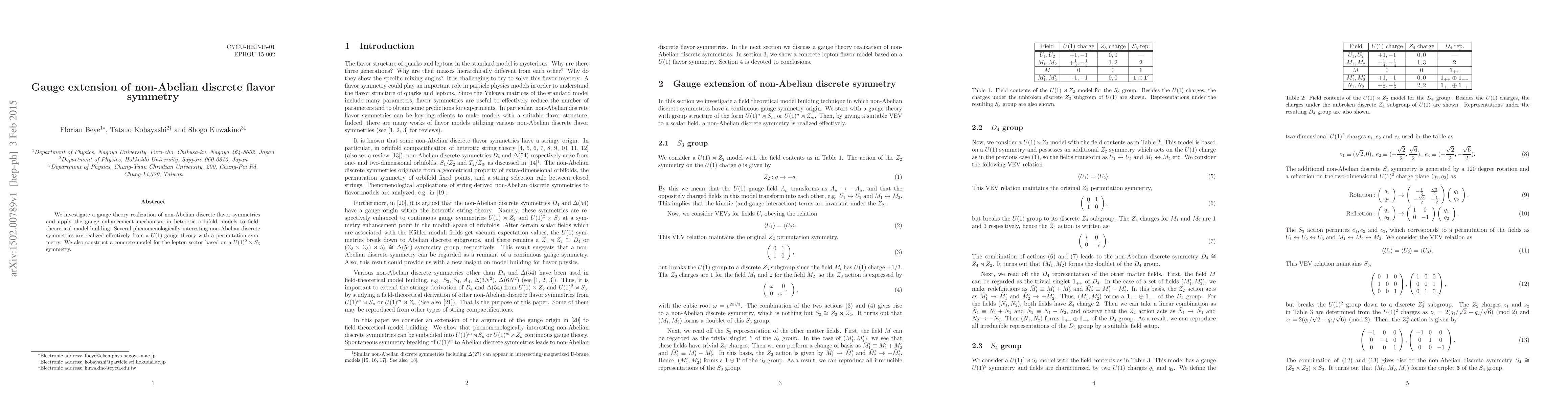This paper explores how non-Abelian discrete flavor symmetries can be realized in gauge theories, using heterotic orbifold models. It constructs a concrete lepton sector model based on a $U(1)^2 \rtimes S_3$ symmetry, demonstrating the gauge enhancement mechanism.