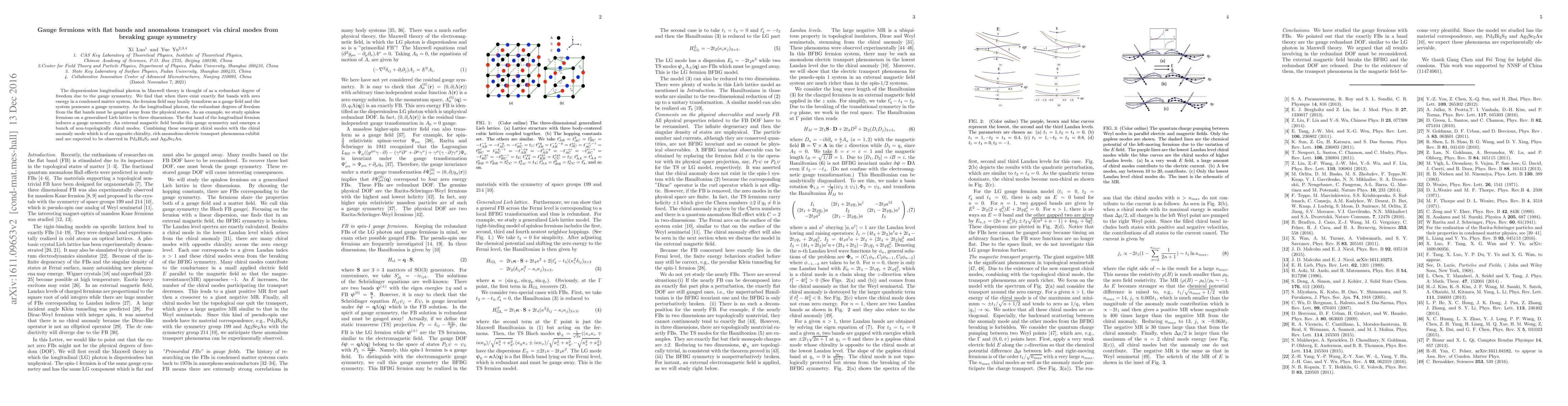 The dispersionless longitudinal photon in Maxwell theory is thought of as a redundant degree of freedom due to the gauge symmetry. We find that when there exist exactly flat bands with zero energy in a condensed matter system, the fermion field may locally transform as a gauge field and the system possesses a gauge symmetry. As the longitudinal photon, the redundant degrees of freedom from the flat bands must be gauged away from the physical states. As an example, we study spinless fermions on a generalized Lieb lattice in three dimensions. The flat band of the longitudinal fermion induces a gauge symmetry. An external magnetic field breaks this gauge symmetry and emerges a bunch of non-topologically chiral modes. Combining these emergent chiral modes with the chiral anomaly mode which is of an opposite chirality, rich anomalous electric transport phenomena exhibit and are expected to be observed in Pd$_3$Bi$_2$S$_2$ and Ag$_3$Se$_2$Au.
