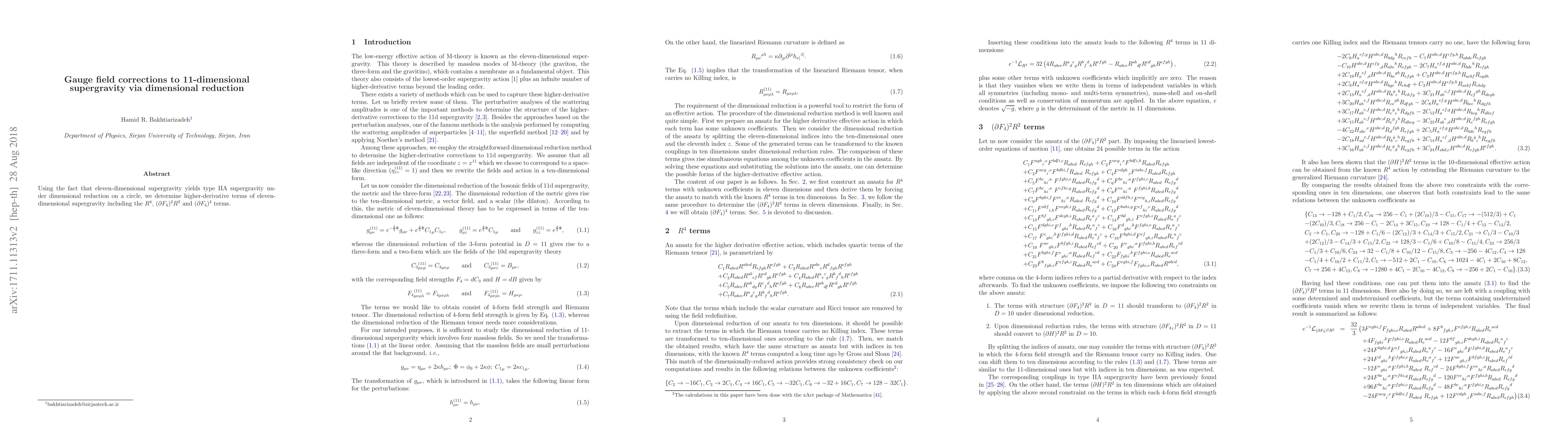 This paper determines higher-derivative corrections in 11-dimensional supergravity by dimensionally reducing it to type IIA supergravity on a circle, identifying terms such as $R^4$, $({\partial F_4})^2 R^2$, and $({\partial F_4})^4$. These corrections provide insights into the dynamics of gauge fields in the reduced theory.