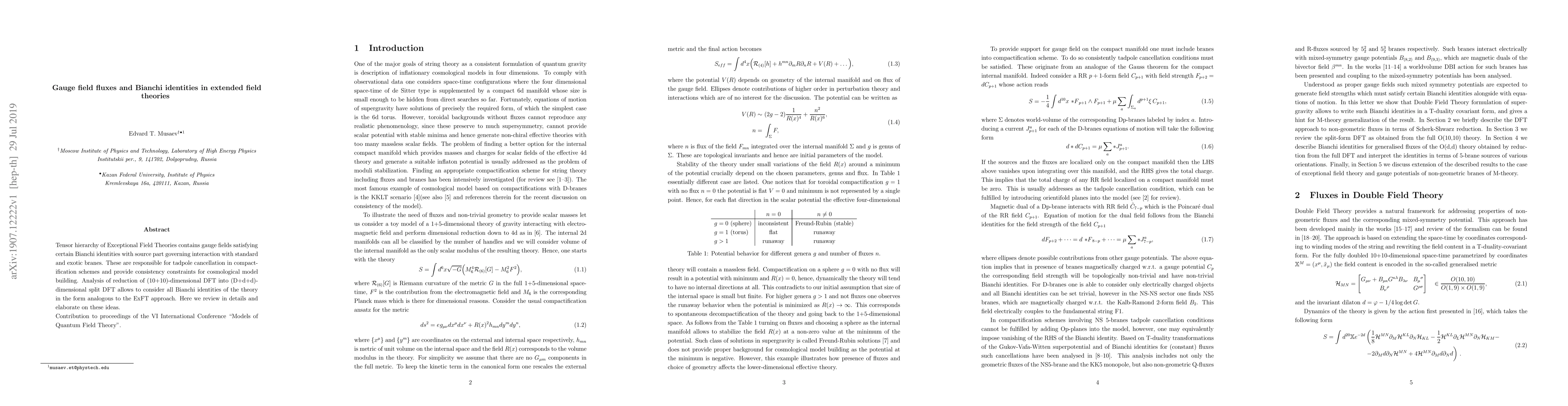 This paper reviews the Bianchi identities in extended field theories, focusing on the gauge fields and their interactions with branes, which play a crucial role in tadpole cancellation and cosmological model consistency. The analysis extends to the reduction of (10+10)-dimensional DFT into (D+d+d)-dimensional split DFT, providing a comprehensive view of the theory's consistency constraints.