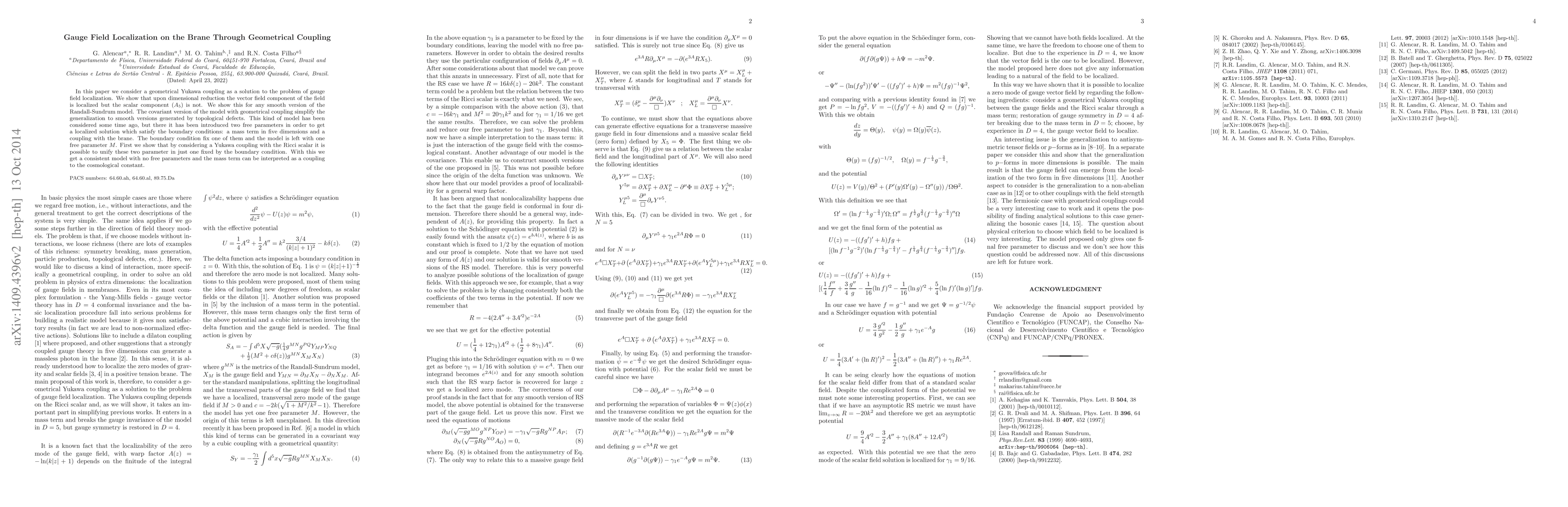 Researchers developed a model that uses geometrical coupling to localize gauge fields on a brane, eliminating two free parameters in the process. This simplifies the model and provides a consistent solution with no additional parameters.