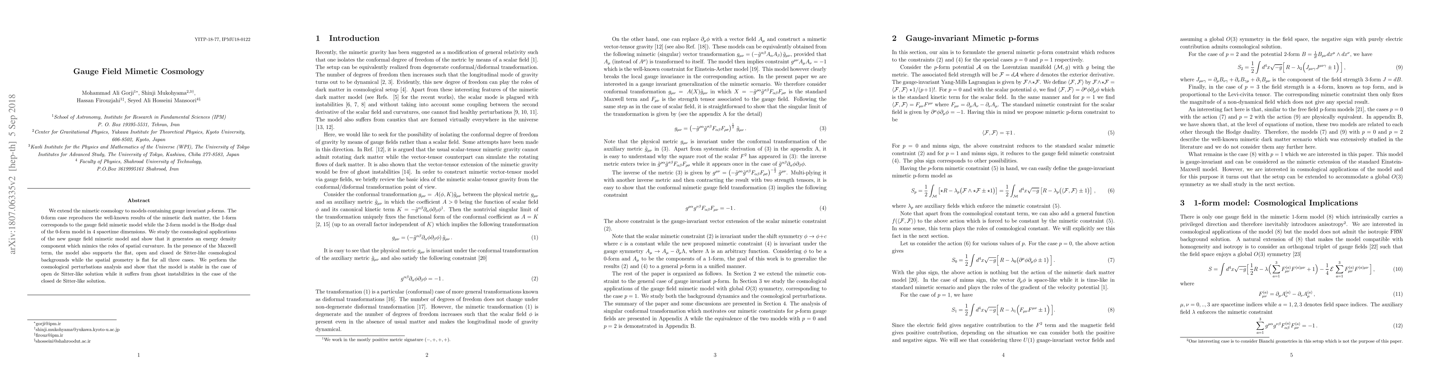 We extend the mimetic cosmology to models containing gauge invariant $p$-forms. The $0$-form case reproduces the well-known results of the mimetic dark matter, the $1$-form corresponds to the gauge field mimetic model while the $2$-form model is the Hodge dual of the $0$-form model in $4$ spacetime dimensions. We study the cosmological applications of the new gauge field mimetic model and show that it generates an energy density component which mimics the roles of spatial curvature. In the presence of the Maxwell term, the model also supports the flat, open and closed de Sitter-like cosmological backgrounds while the spatial geometry is flat for all three cases. We perform the cosmological perturbations analysis and show that the model is stable in the case of open de Sitter-like solution while it suffers from ghost instabilities in the case of the closed de Sitter-like solution.