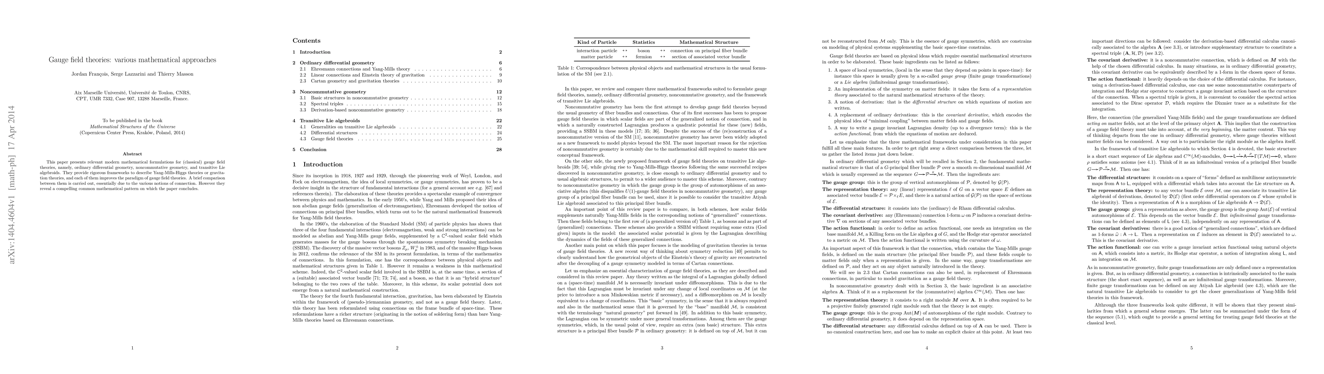 This paper presents relevant modern mathematical formulations for (classical) gauge field theories, namely, ordinary differential geometry, noncommutative geometry, and transitive Lie algebroids. They provide rigorous frameworks to describe Yang-Mills-Higgs theories or gravitation theories, and each of them improves the paradigm of gauge field theories. A brief comparison between them is carried out, essentially due to the various notions of connection. However they reveal a compelling common mathematical pattern on which the paper concludes.