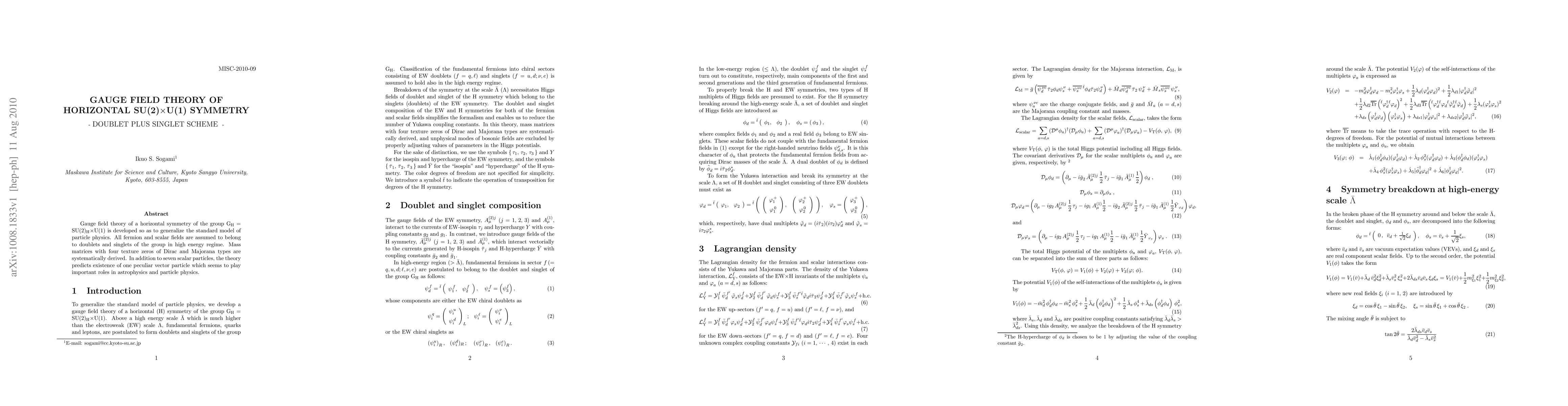 This research paper develops a gauge field theory of horizontal SU(2) X U(1) symmetry to generalize the standard model of particle physics, predicting mass matrices with four texture zeros and a peculiar vector particle.