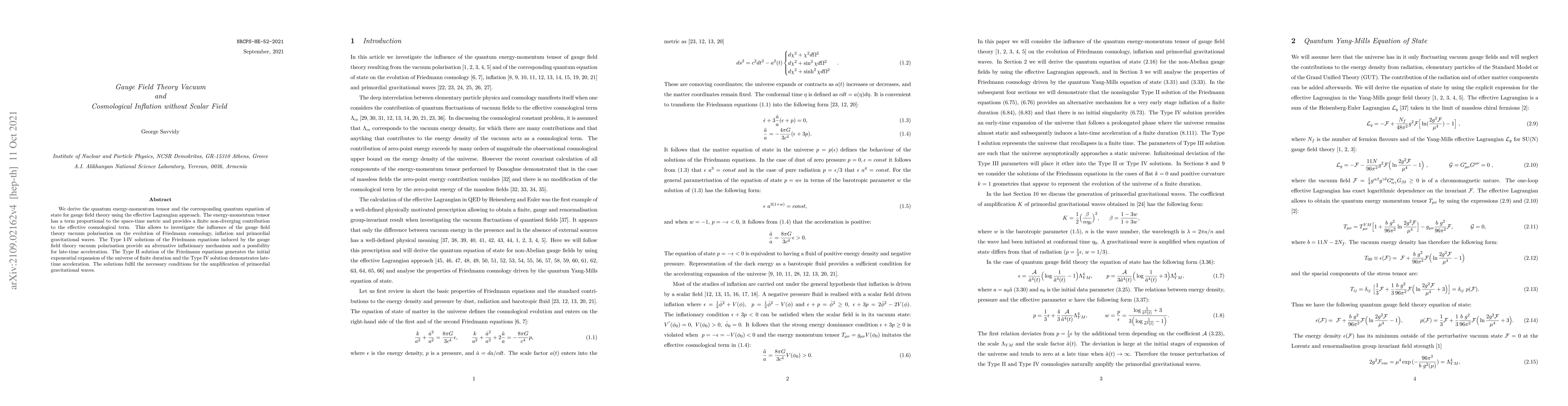 This research presents an alternative inflationary mechanism and late-time acceleration in cosmology using gauge field theory vacuum polarization, derived via quantum energy-momentum tensor and equation of state. It proposes Type I-IV Friedmann solutions fulfilling conditions for primordial gravitational wave amplification without requiring scalar fields.