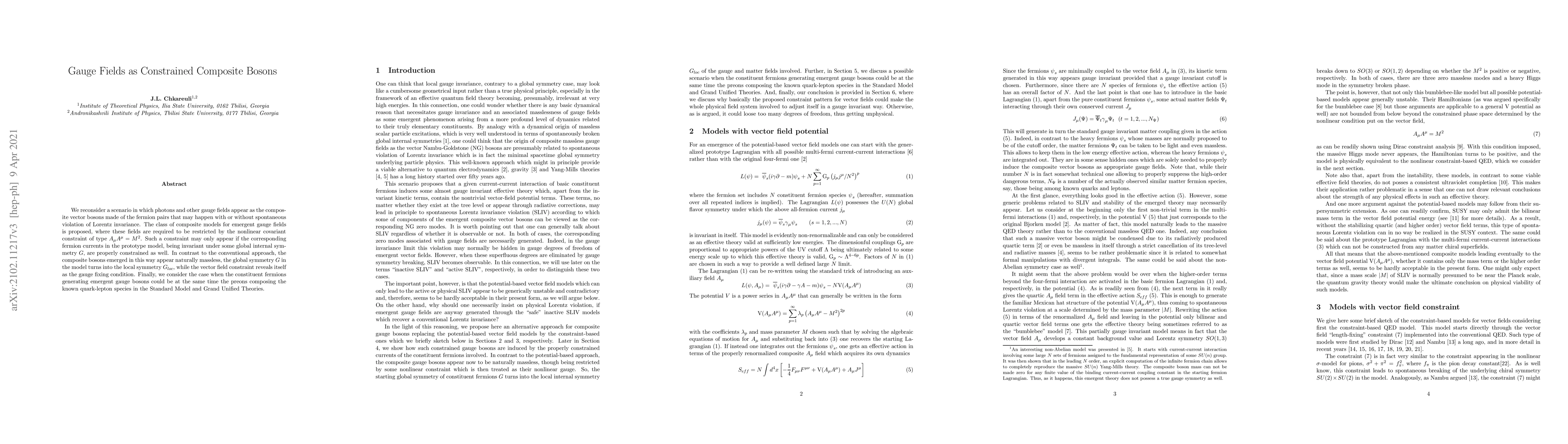 We reconsider a scenario in which photons and other gauge fields appear as the composite vector bosons made of the fermion pairs that may happen with or without spontaneous violation of Lorentz invariance. The class of composite models for emergent gauge fields is proposed, where these fields are required to be restricted by by the nonlinear covariant constraint of type $ A_{\mu }^{2}=M^{2}$. Such a constraint may only appear if the corresponding fermion currents in the prototype model, being invariant under some global internal symmetry $G$, are properly constrained as well. In contrast to the conventional approach, the composite bosons emerged in this way appear naturally massless, the global symmetry $G$ in the model turns into the local symmetry $G_{loc}$, while the vector field constraint reveals itself as the gauge fixing condition. Finally, we consider the case when the constituent fermions generating emergent gauge bosons could be at the same time the preons composing the known quark-lepton species in the Standard Model and Grand Unified Theories.