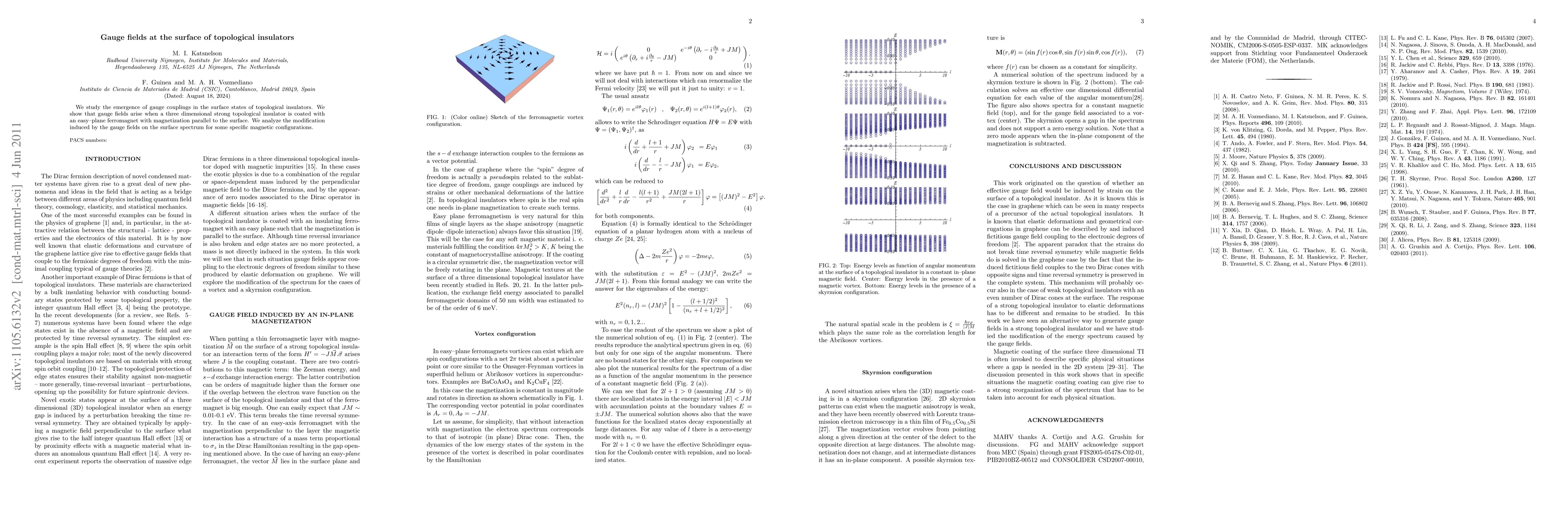 This paper investigates how gauge fields emerge in the surface states of topological insulators when coated with an easy-plane ferromagnet. It demonstrates that these gauge fields modify the surface spectrum, particularly under specific magnetic configurations.