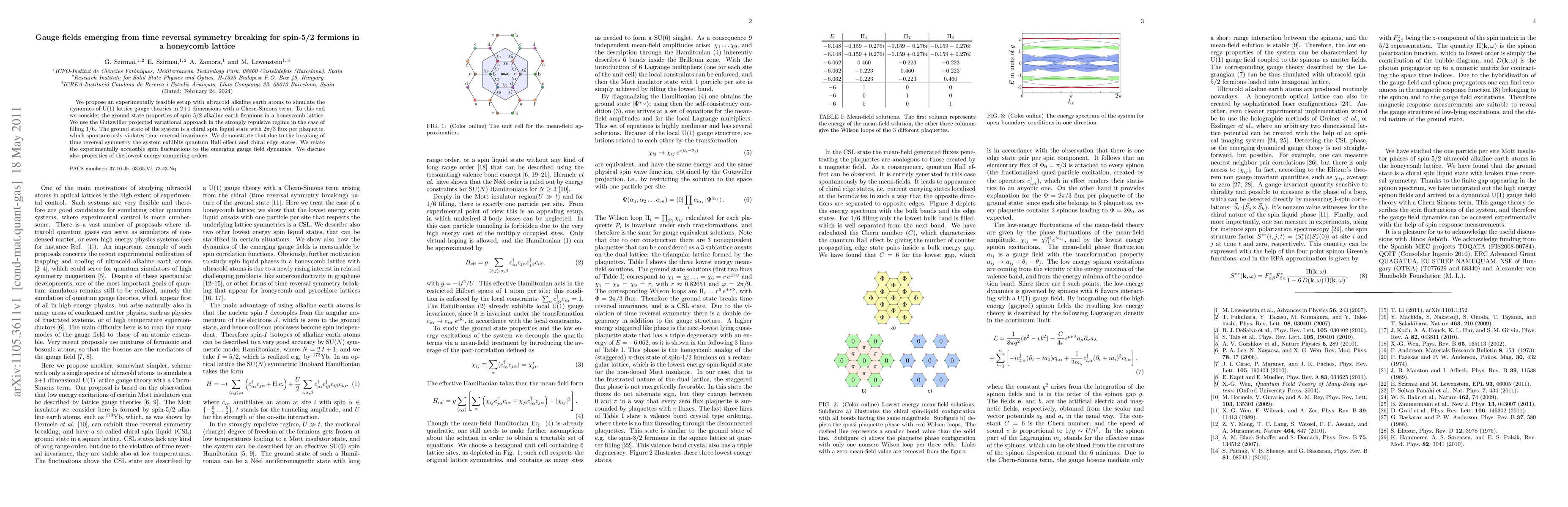 We propose an experimentally feasible setup with ultracold alkaline earth atoms to simulate the dynamics of U(1) lattice gauge theories in 2+1 dimensions with a Chern-Simons term. To this end we consider the ground state properties of spin-5/2 alkaline earth fermions in a honeycomb lattice. We use the Gutzwiller projected variational approach in the strongly repulsive regime in the case of filling 1/6. The ground state of the system is a chiral spin liquid state with $2\pi/3$ flux per plaquette, which spontaneously violates time reversal invariance. We demonstrate that due to the breaking of time reversal symmetry the system exhibits quantum Hall effect and chiral edge states. We relate the experimentally accessible spin fluctuations to the emerging gauge field dynamics. We discuss also properties of the lowest energy competing orders.